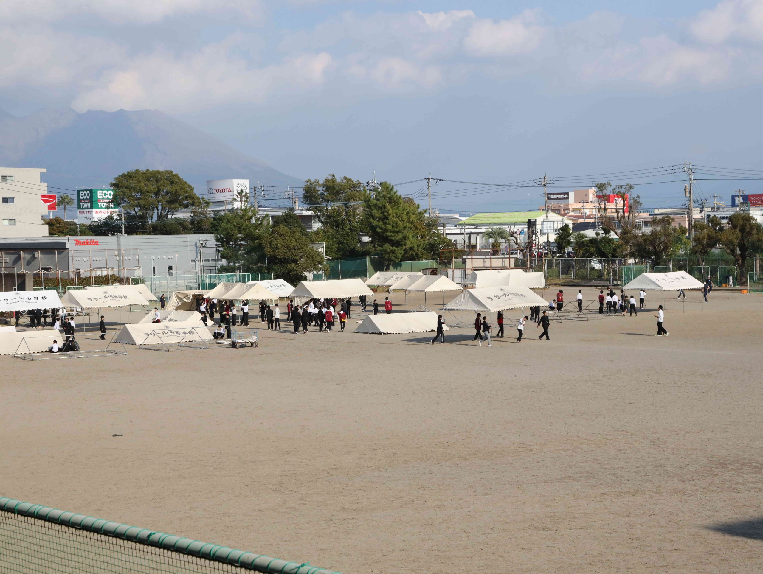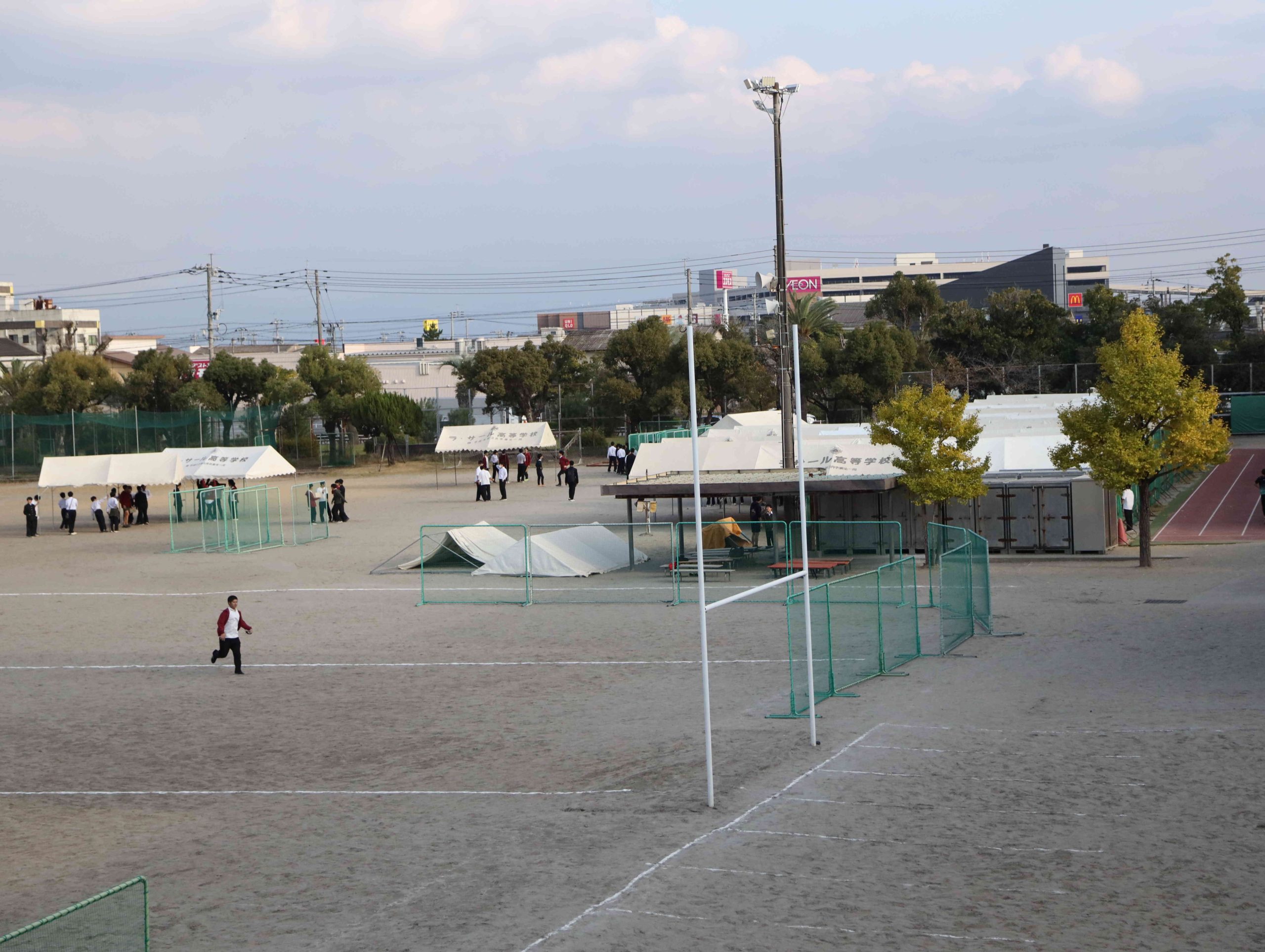 組み立てたテントはグラウンドの隅にまとめて仮置きします。明日土曜日の午後に、改めて所定の位置に移動させます。たくさんの生徒が協力してくれました。