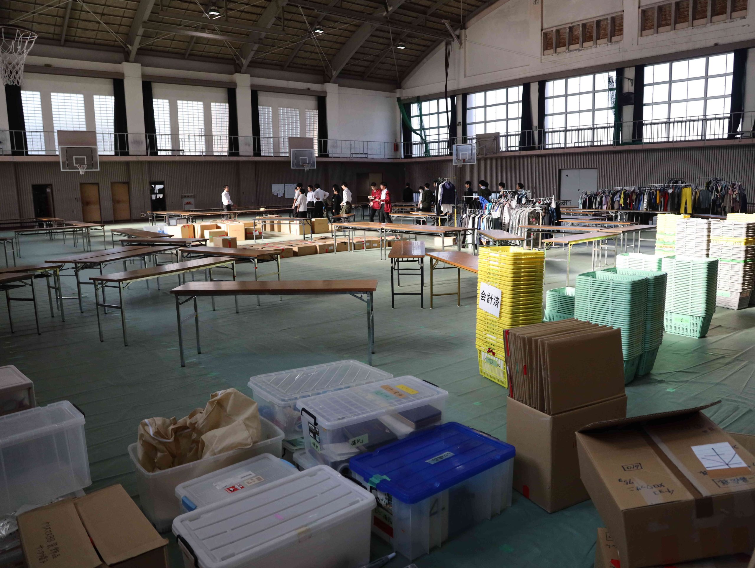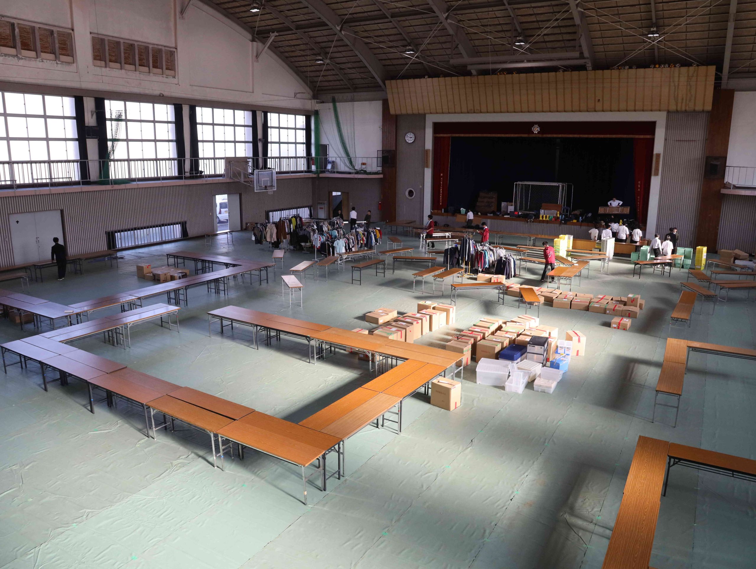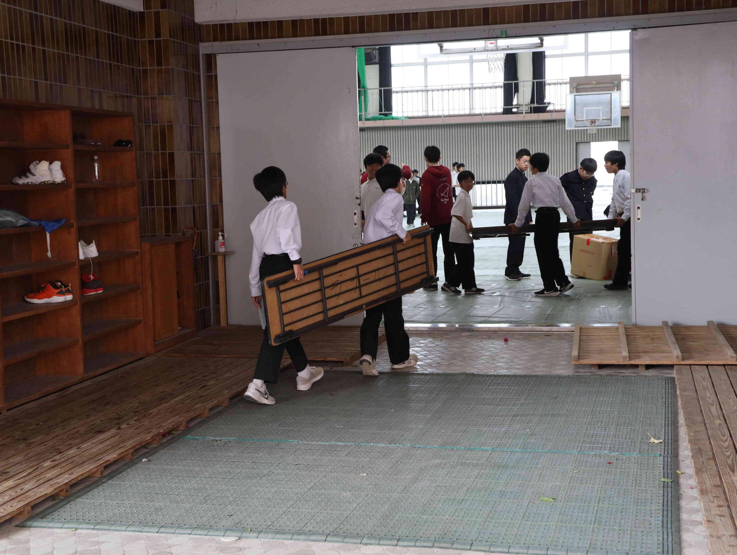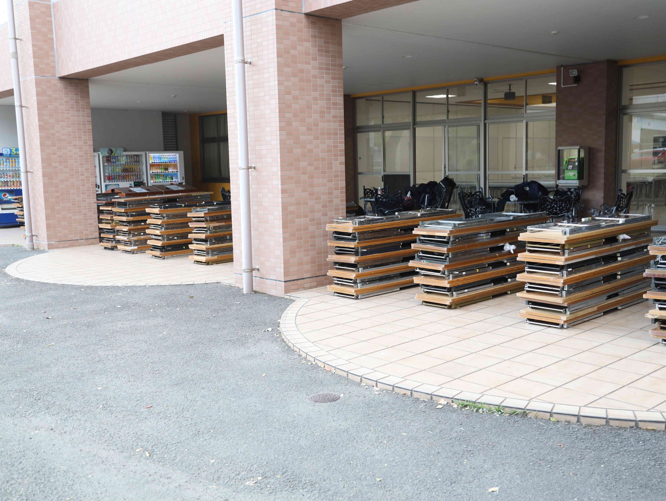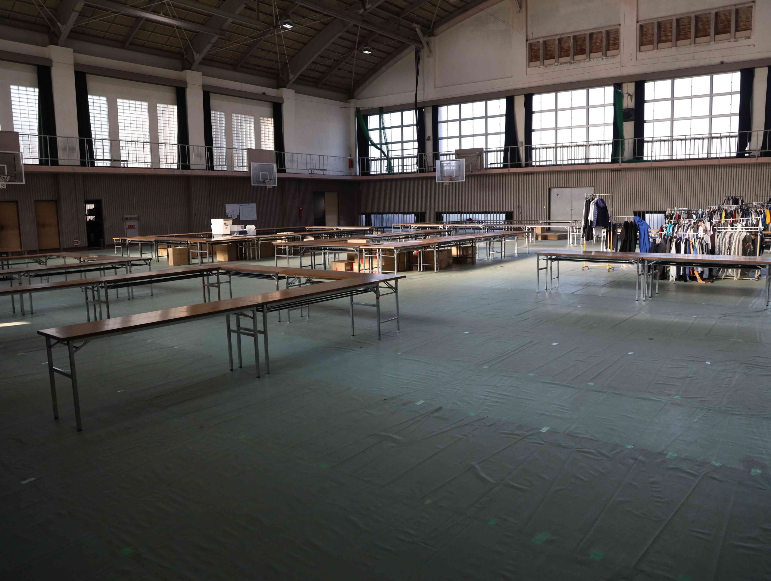 そのテント内に置かれる長机も、ヨセフホール一階にスタンバイ完了です。