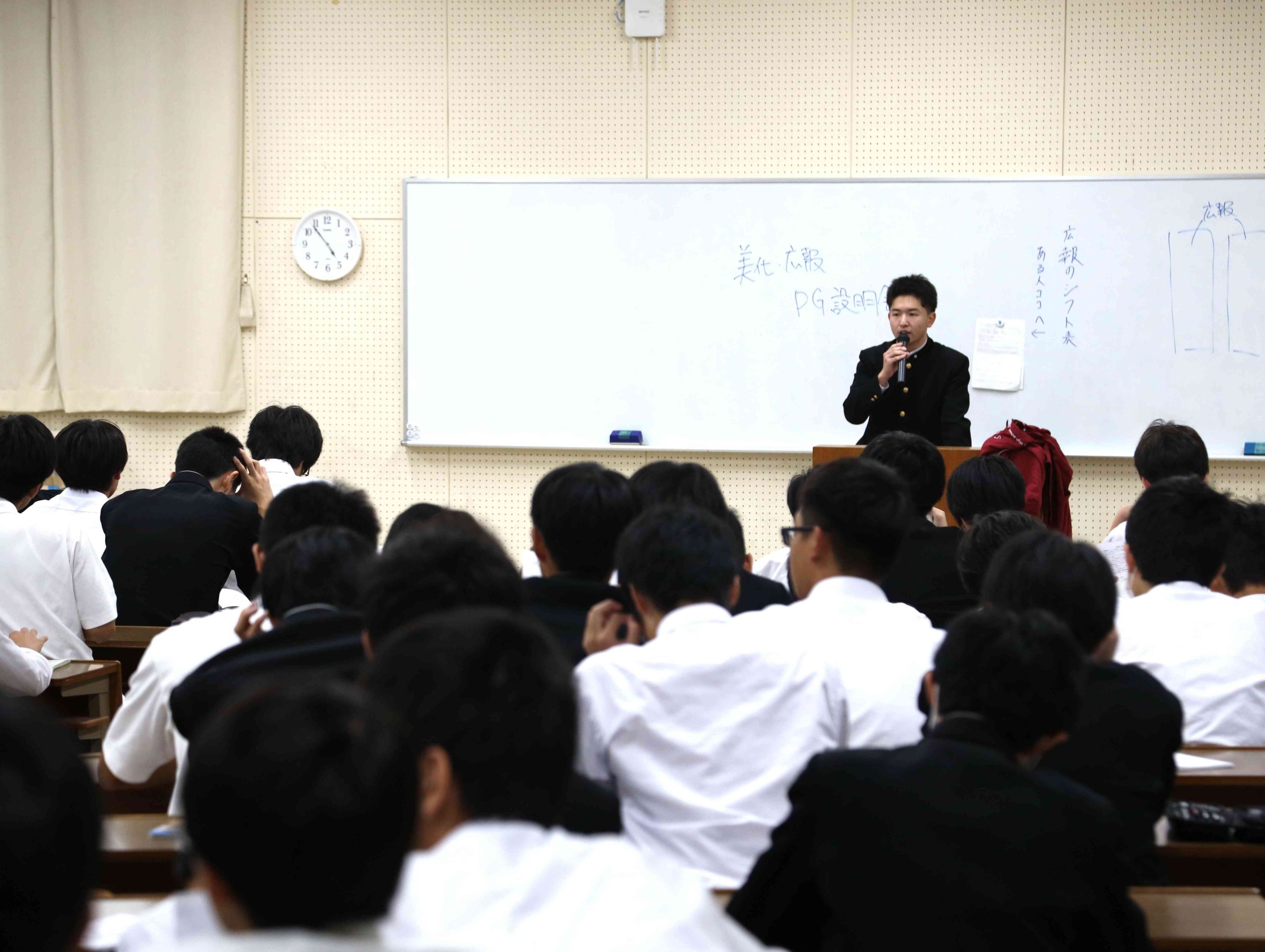 こちらはもう片方の高二のクラスで、すでにディベートが始まっています。ディベートでは生徒が賛成派と反対派に分かれ、まずそれぞれの主張を述べ、相手方を批判して、その批判に反論します。聴衆はジャッジを行います。これらをすべて英語で行うことで、生徒諸君は確実に実力を高めていきます。またいちばん後ろでは先生が話し方や態度、内容をチェックし、あとで的確にアドバイスします。