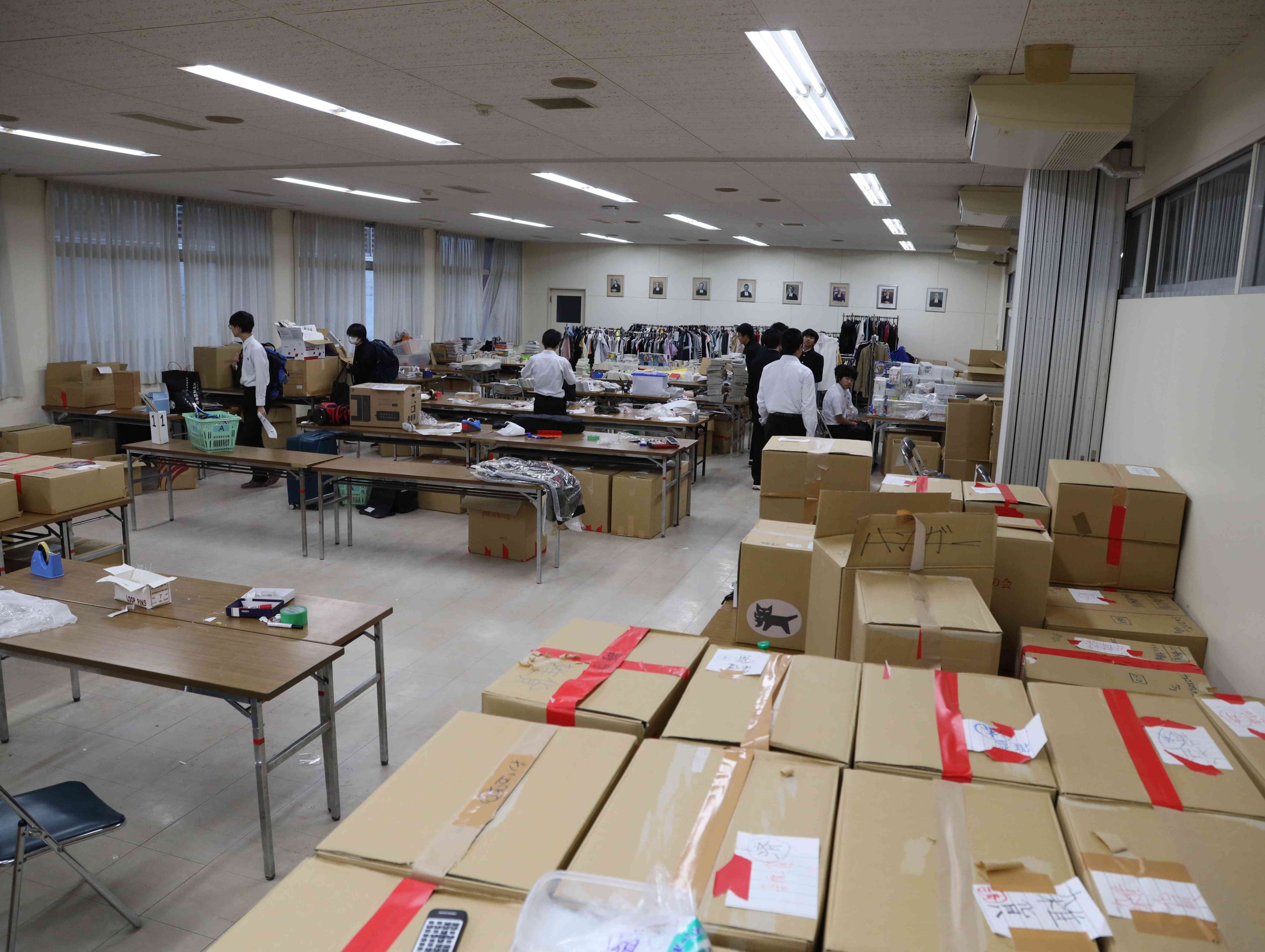 会場作りも大詰めです。商品の箱を長机で囲まれた係員スペースに移動させています。