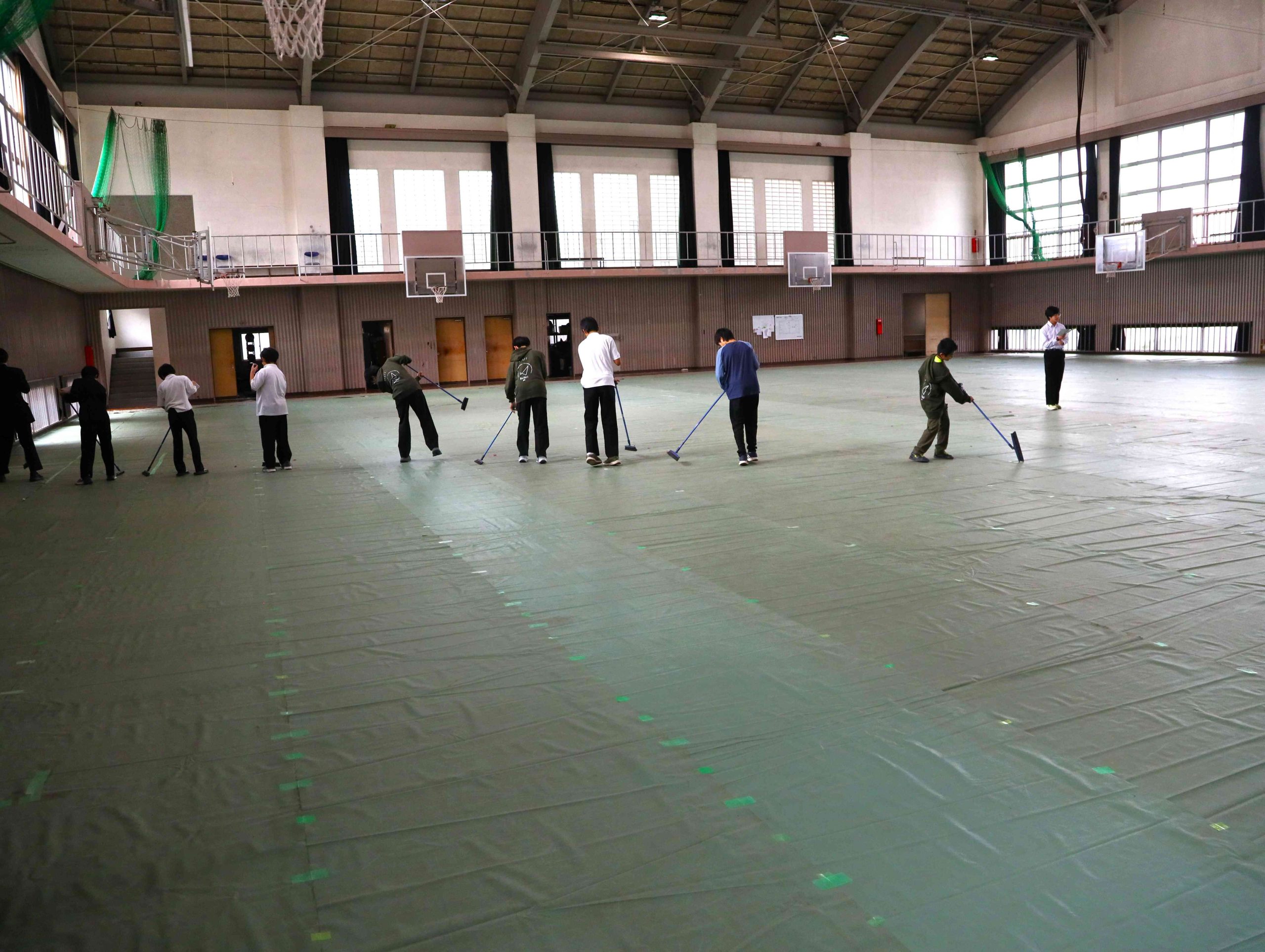 合宿① 本校では春休みと夏休みに、多くの部活が学校で合宿を行います。その開始を前に、体育館に運び込まれたレンタル布団の山です。