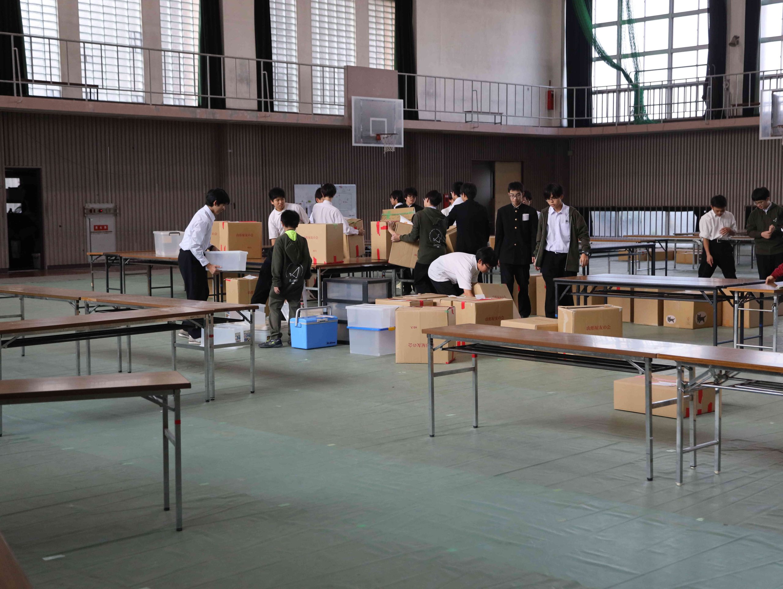 寮で避難訓練を行いました。「学習中に錦江湾を震源とする地震が発生し、すぐに大津波警報が出る」という想定で行われました。まずはそれぞれの生徒が自分の机の下にもぐり、ものの落下や倒壊に備えます。