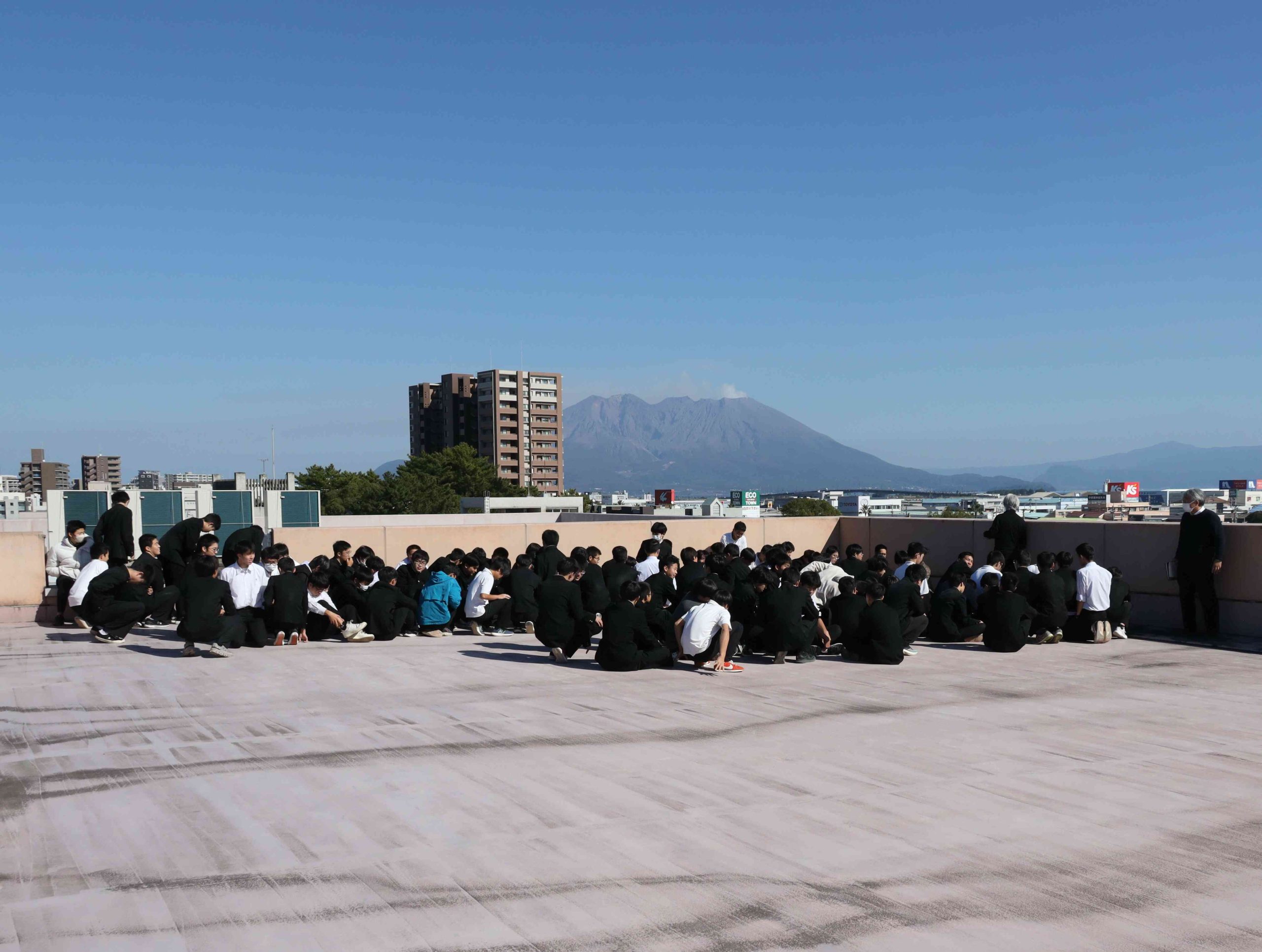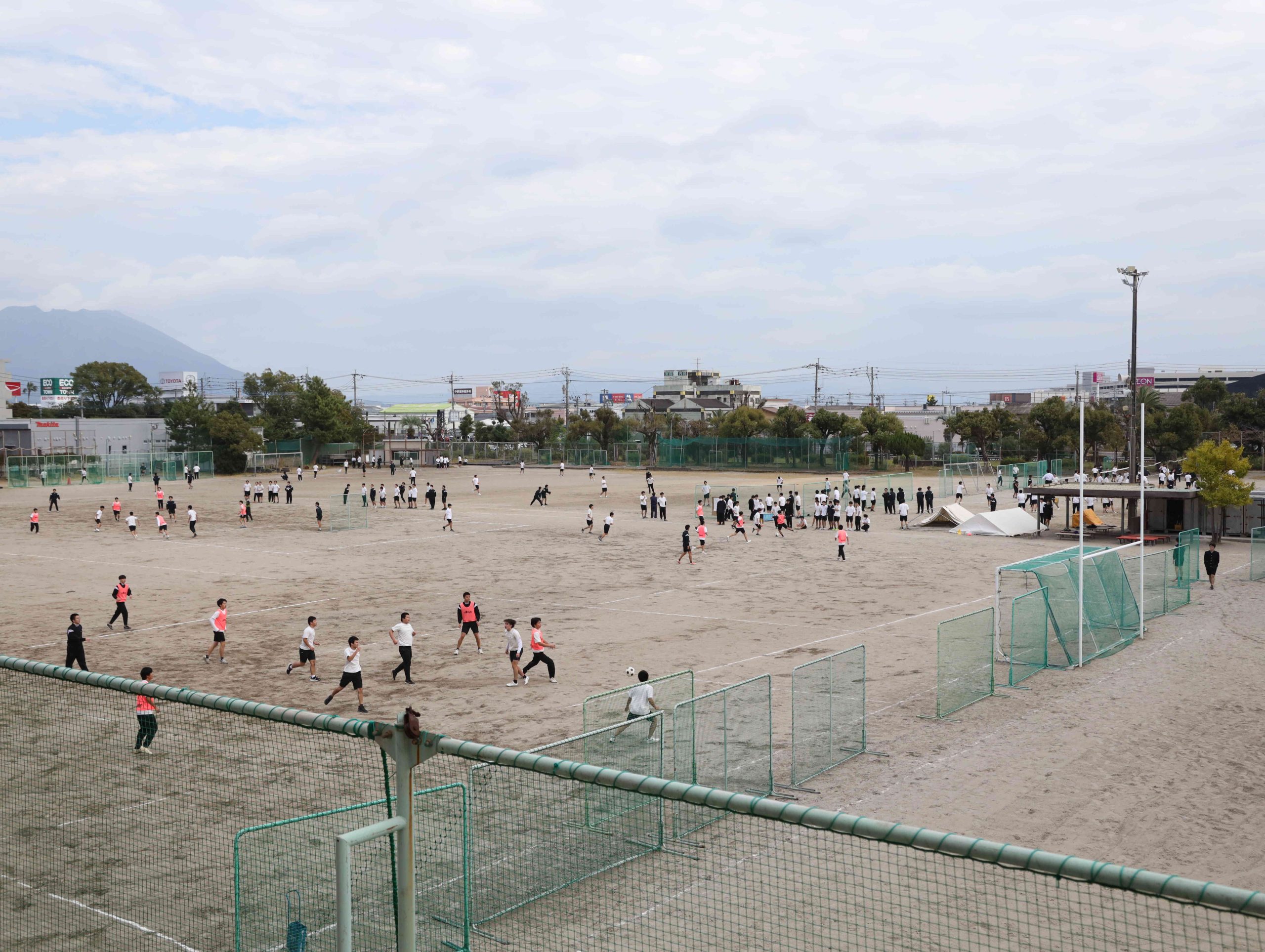 秋空の下、体育の授業です。奧には桜島が見えていますが、この日は噴火はありませんでした。