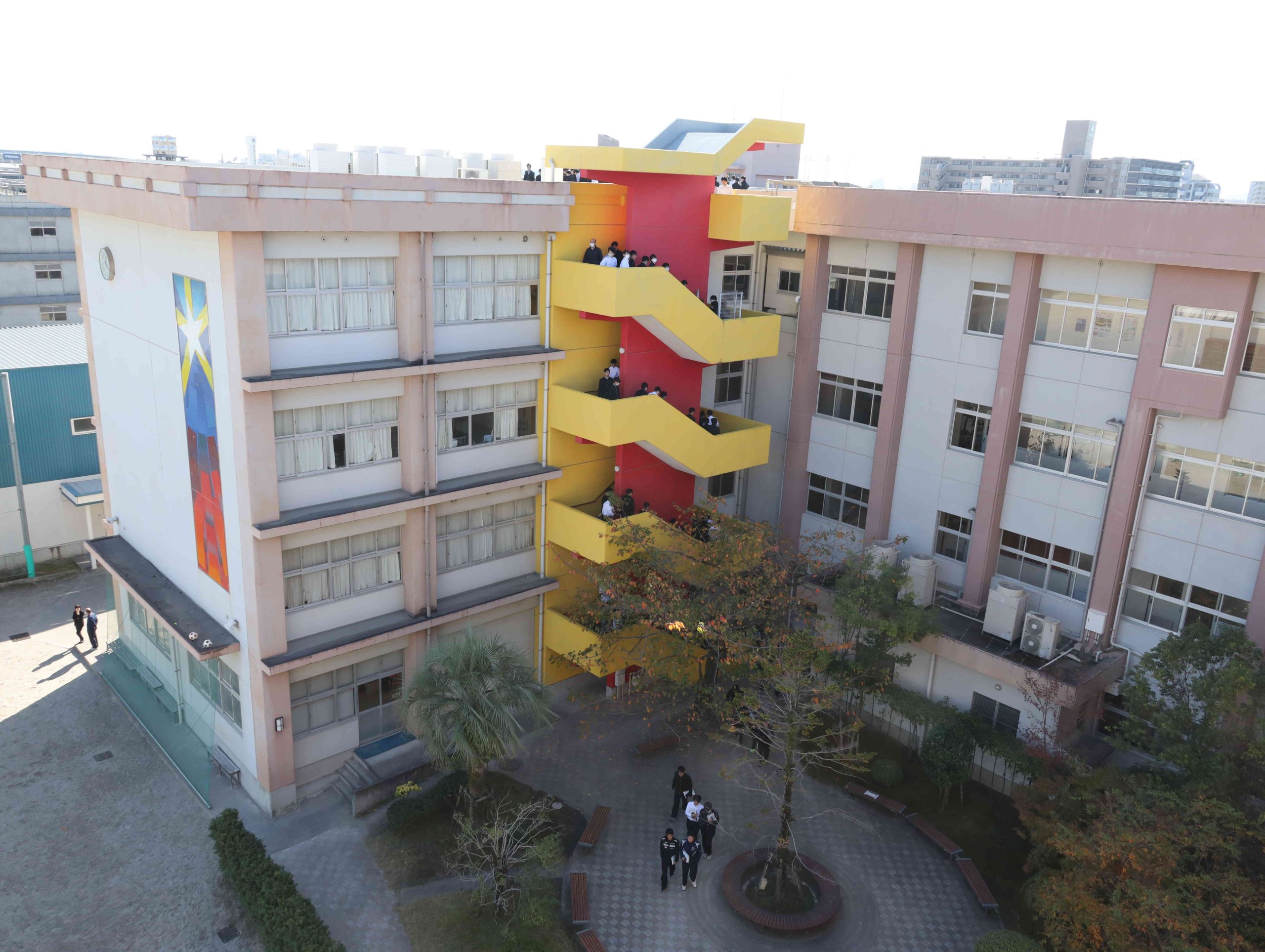 この日、毎年恒例の防災・避難訓練が行われました。大地震後と津波警報が発令された想定で、全員が屋上に避難します。これは日頃上がれない高校校舎屋上に避難した生徒たちです。