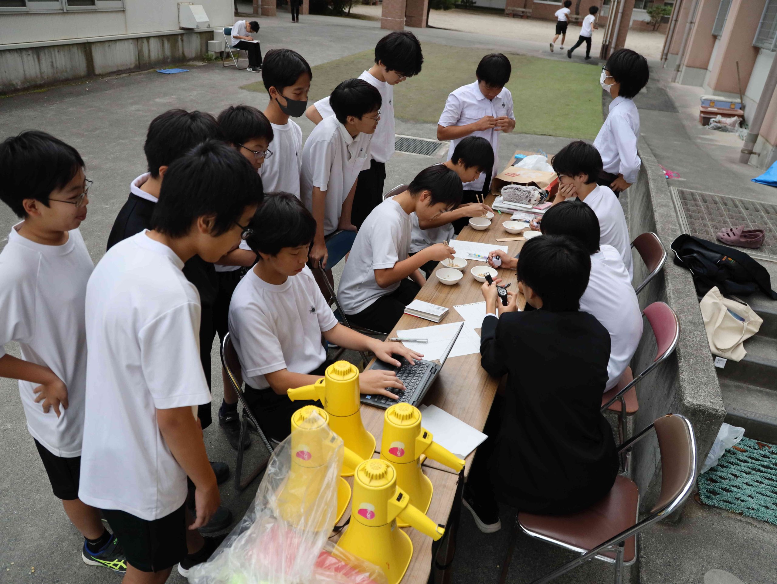 目下、中2家庭科で調理実習を行っています。中2生徒ができあがった料理(豚肉の生姜焼き)を担任や副担任の先生方に届けにきました。汁が垂れそうになったので、先生があわてて支えています。