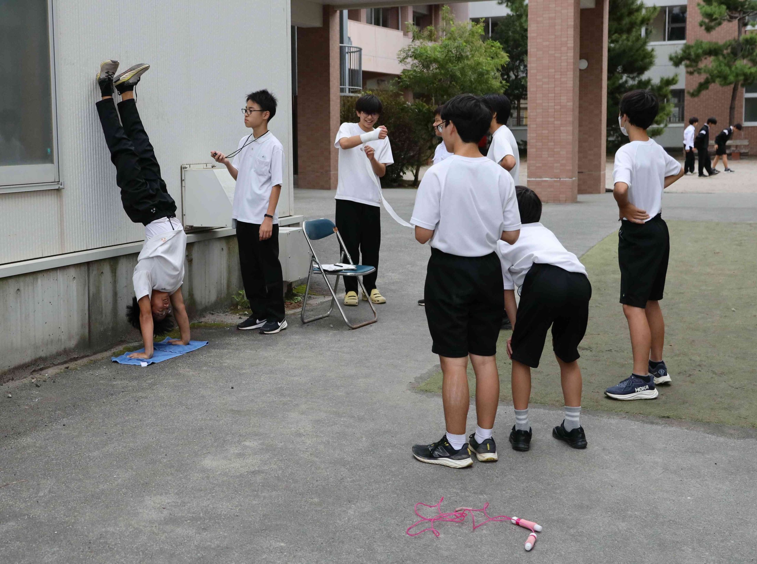 こちらも副種目の1つであり、逆立ちをできるだけ長く続けられた人が優勝です。そばでは実行委員が時間を測っています。