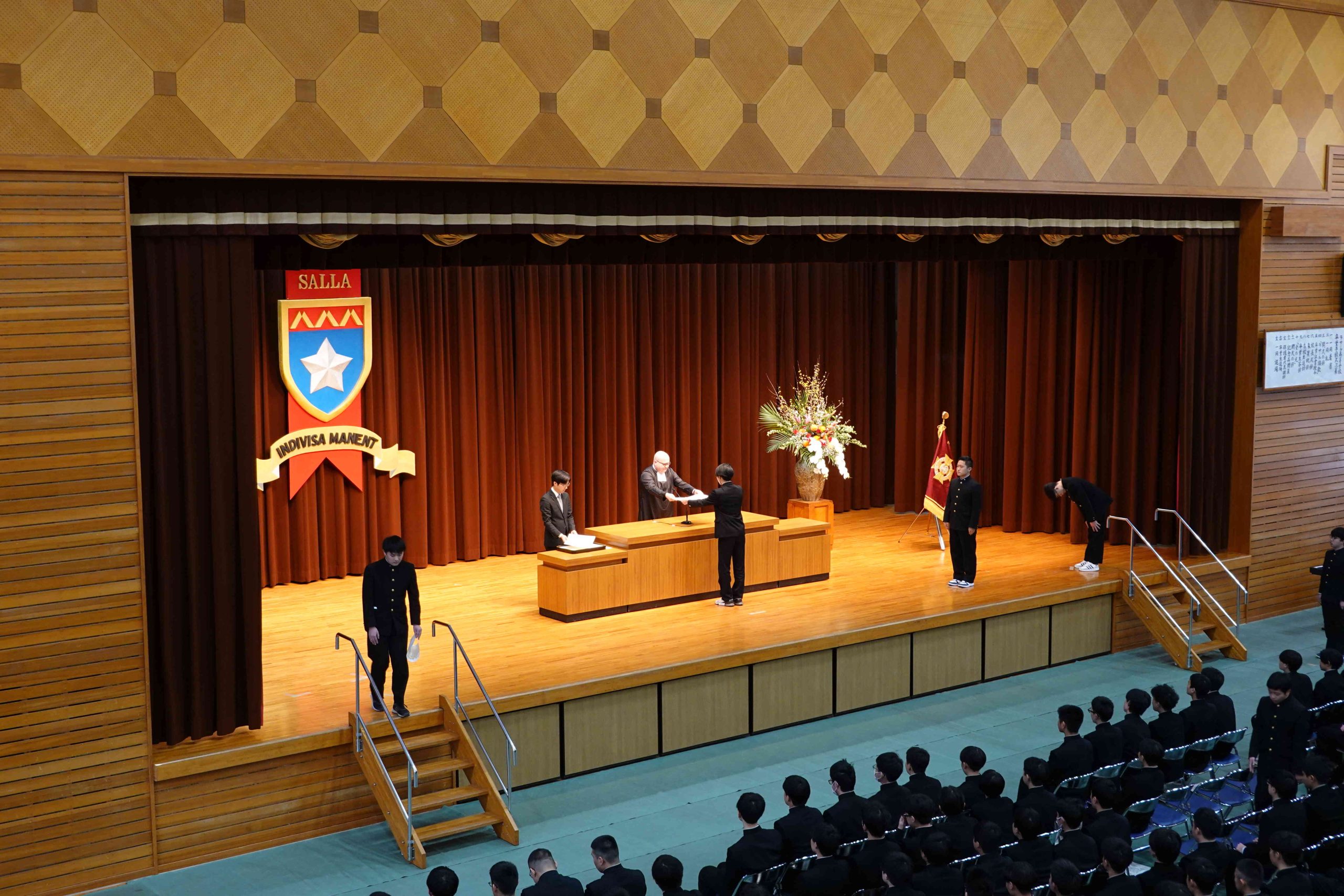 2月には高校卒業予餞式が行われます。檀上で校長先生から一人一人に卒業証書が手渡されます。卒業生の立派な所作から、学園生活を通じた成長が感じられます。6年または3年のラ・サールでの生活を終え、生徒たちはそれぞれ新たなステージへとすすみます。