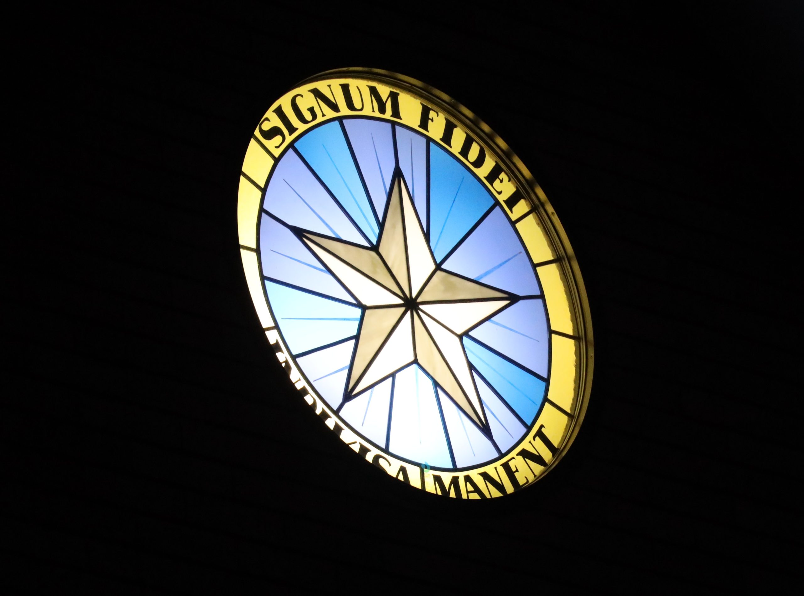 クリスマスを控え、修道院にイルミネーションが点灯し、学校の夕景に彩りを添えています。十字架の上の丸い光の部分には星が描かれ、その上に「SIGNUM FIDEI」(ラテン語 で 「 信 仰 の し る し 」 )、 下 に「INDIVISA MANENT」(ラテン語で「離れず、共にとどまれ」)と記されています。