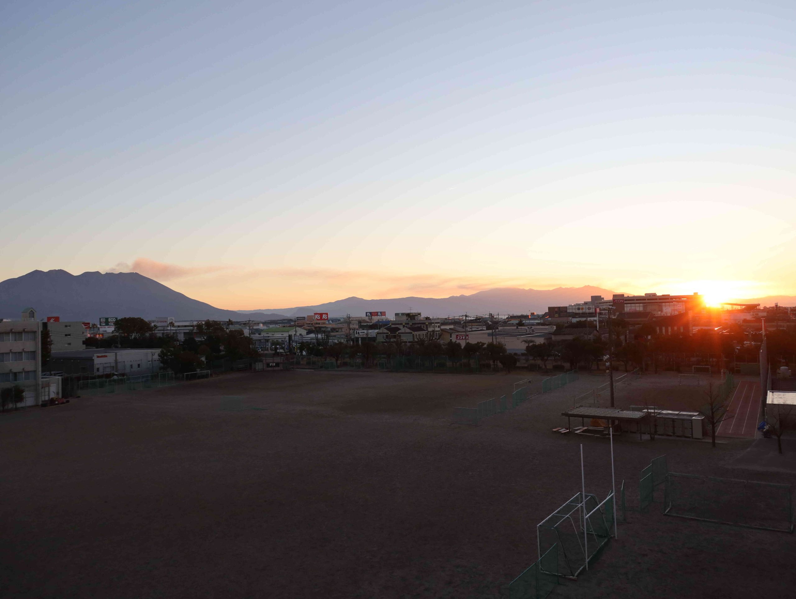 明けましておめでとうございます。今年も学園のさまざまなシーンをご紹介しますので、ぜひお楽しみください。写真は高校校舎4階のベランダから撮影した日の出です。桜島の噴煙がたなびいています。