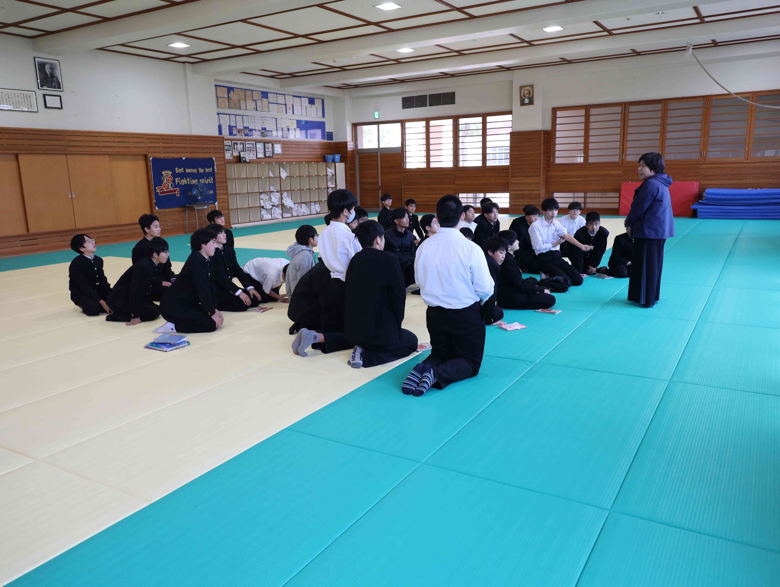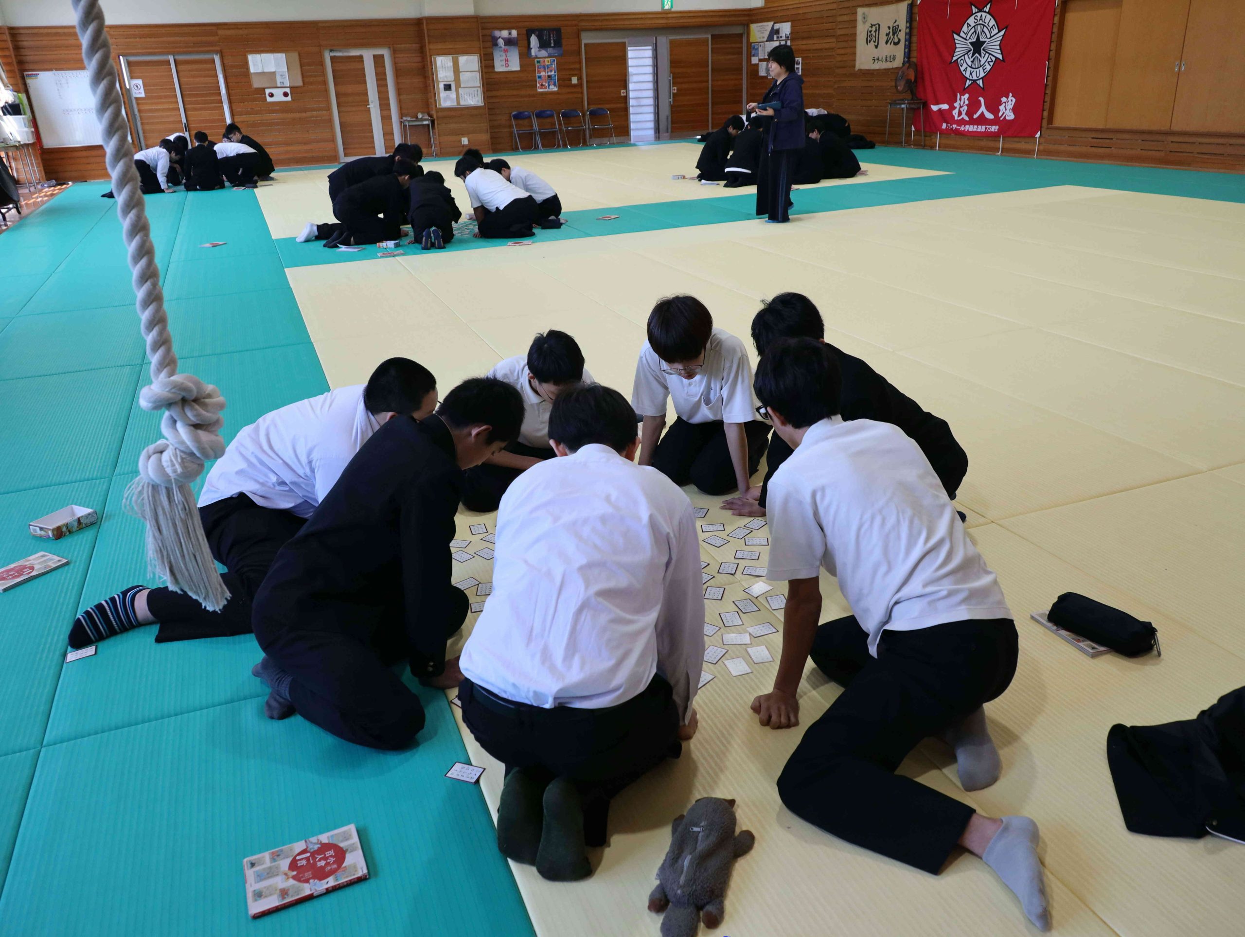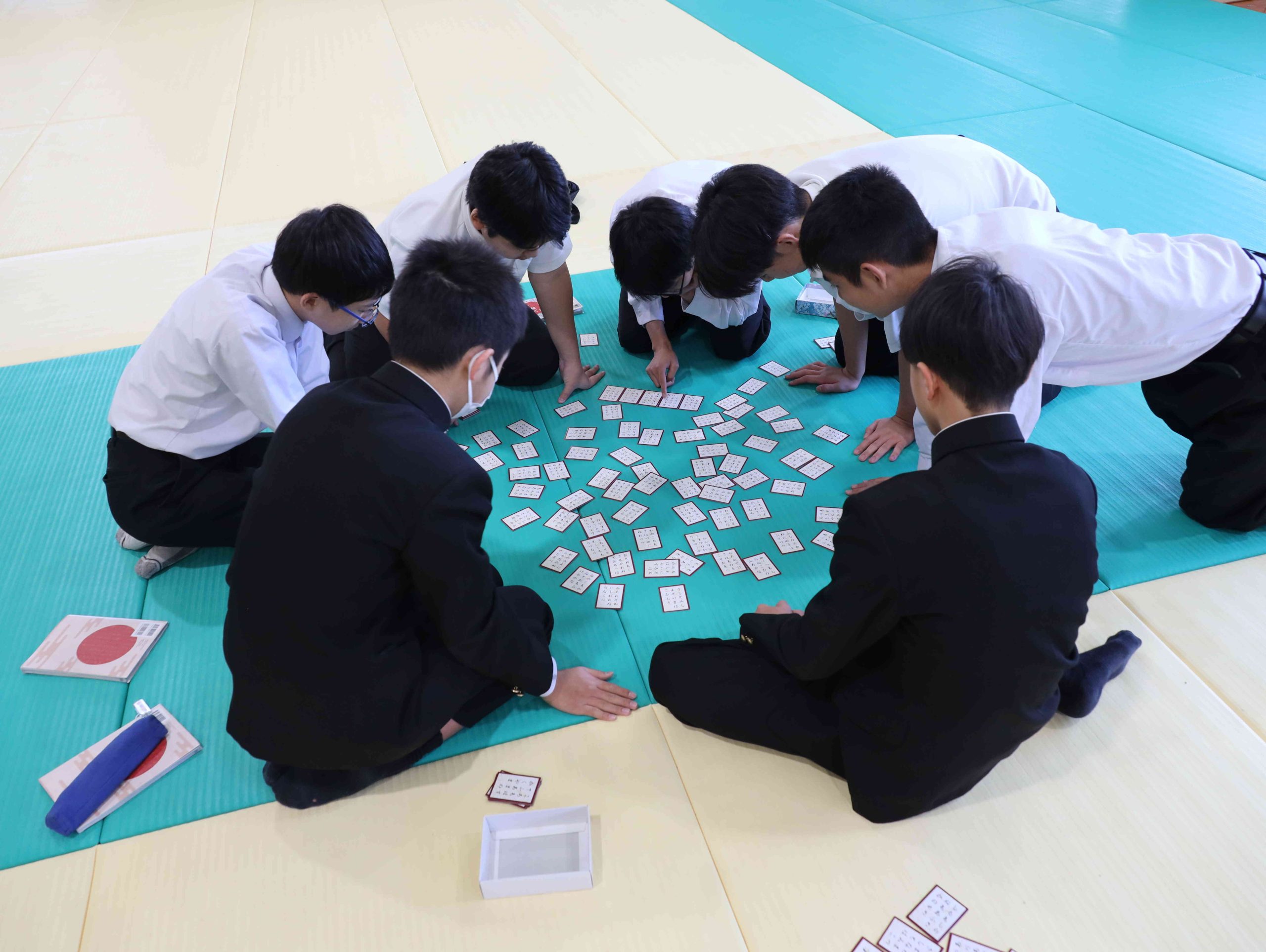 中学2年の文法の授業で百人一首に取り組んでおりますが、その仕上げとして柔道場を借りてカルタ大会を実施しました。