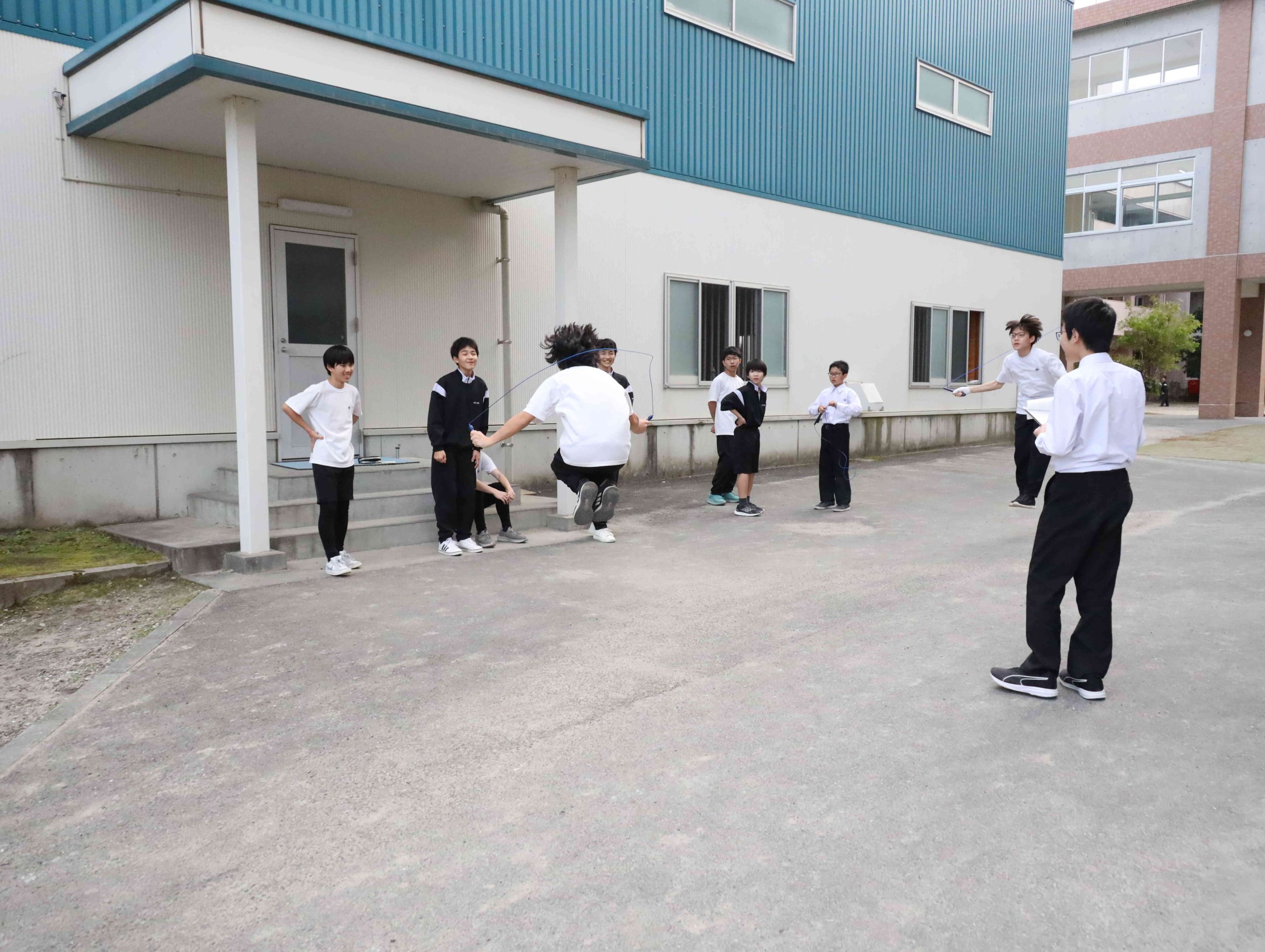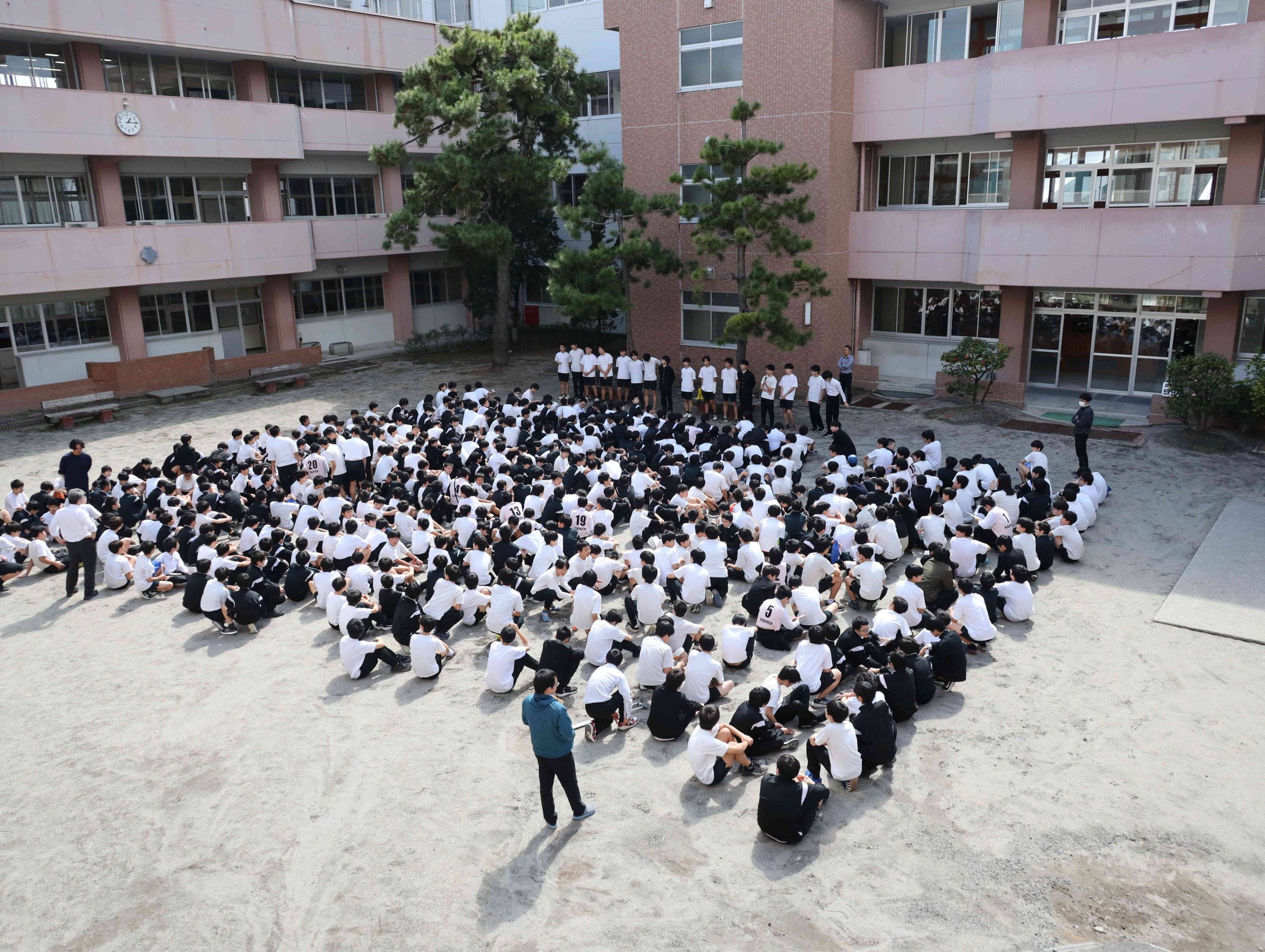 こちらは高校校舎前に集まった高校2年生が、学年主任の話を聞いているところです。こうして自分たちの置かれた状況を確認し、目線と足並みを揃えて、新しい学年がスタートします。
