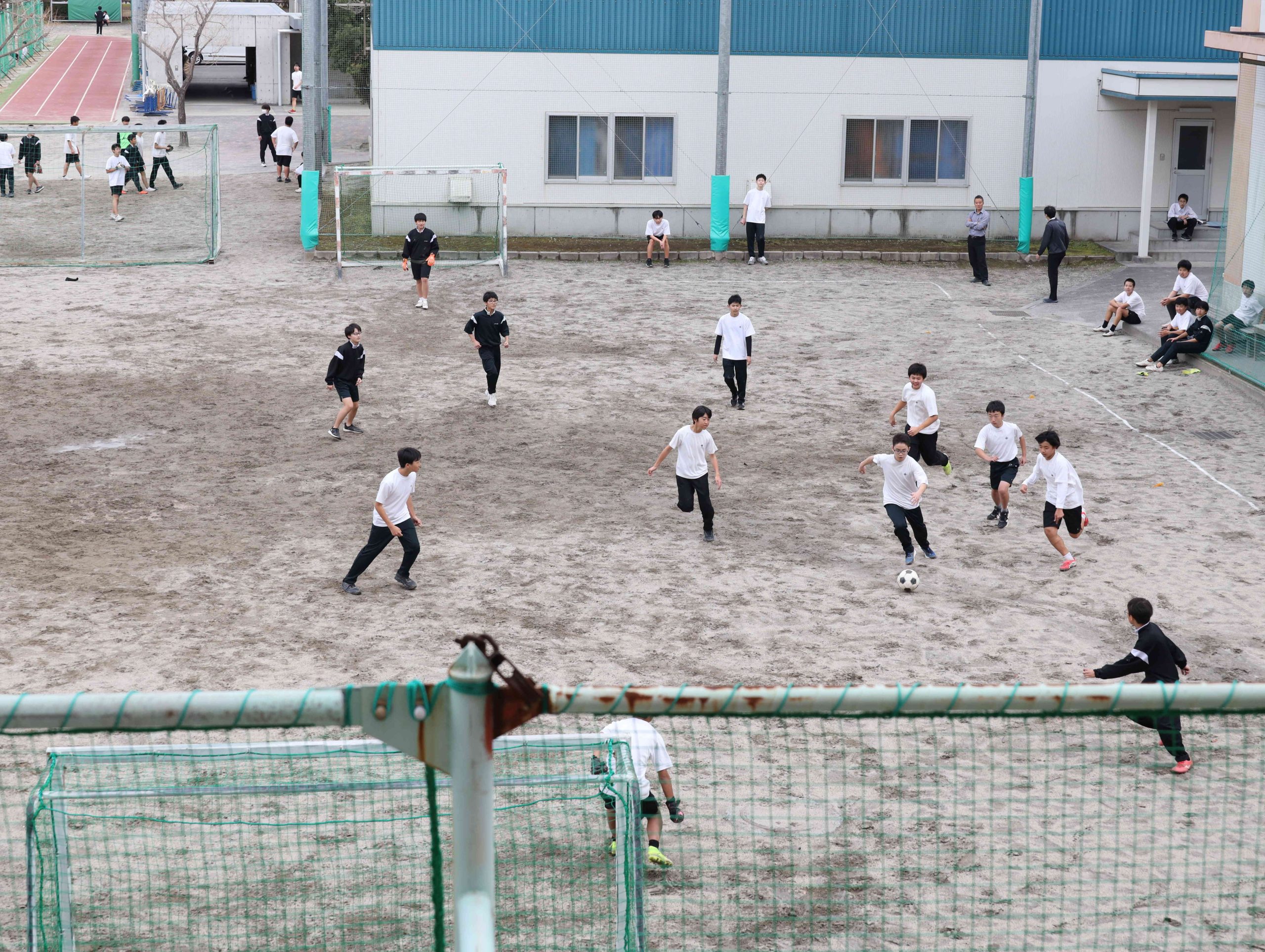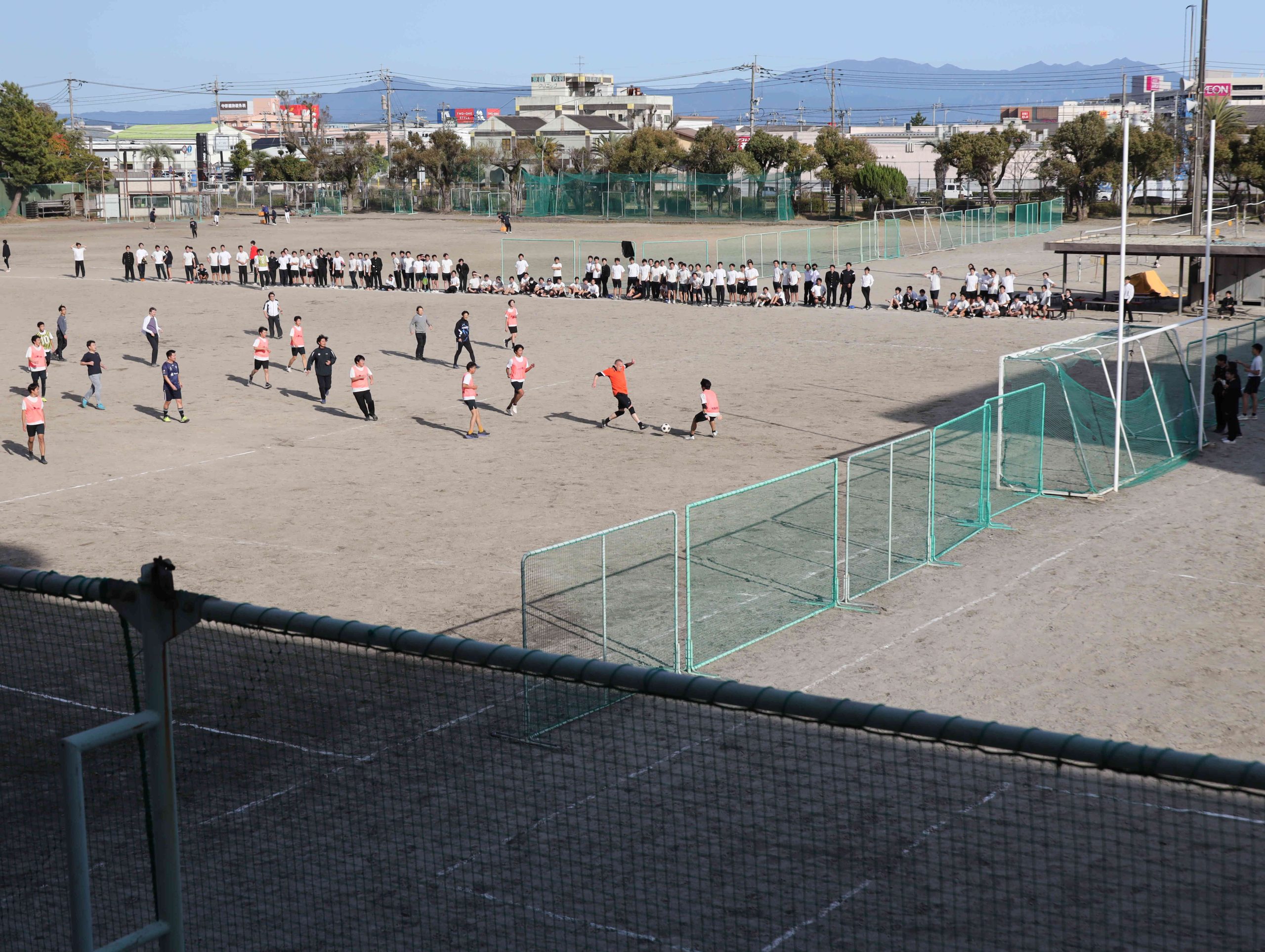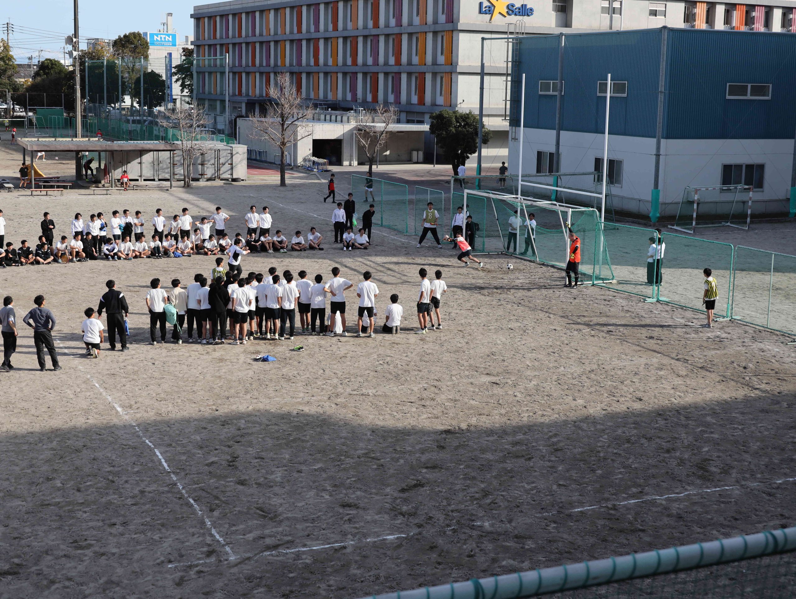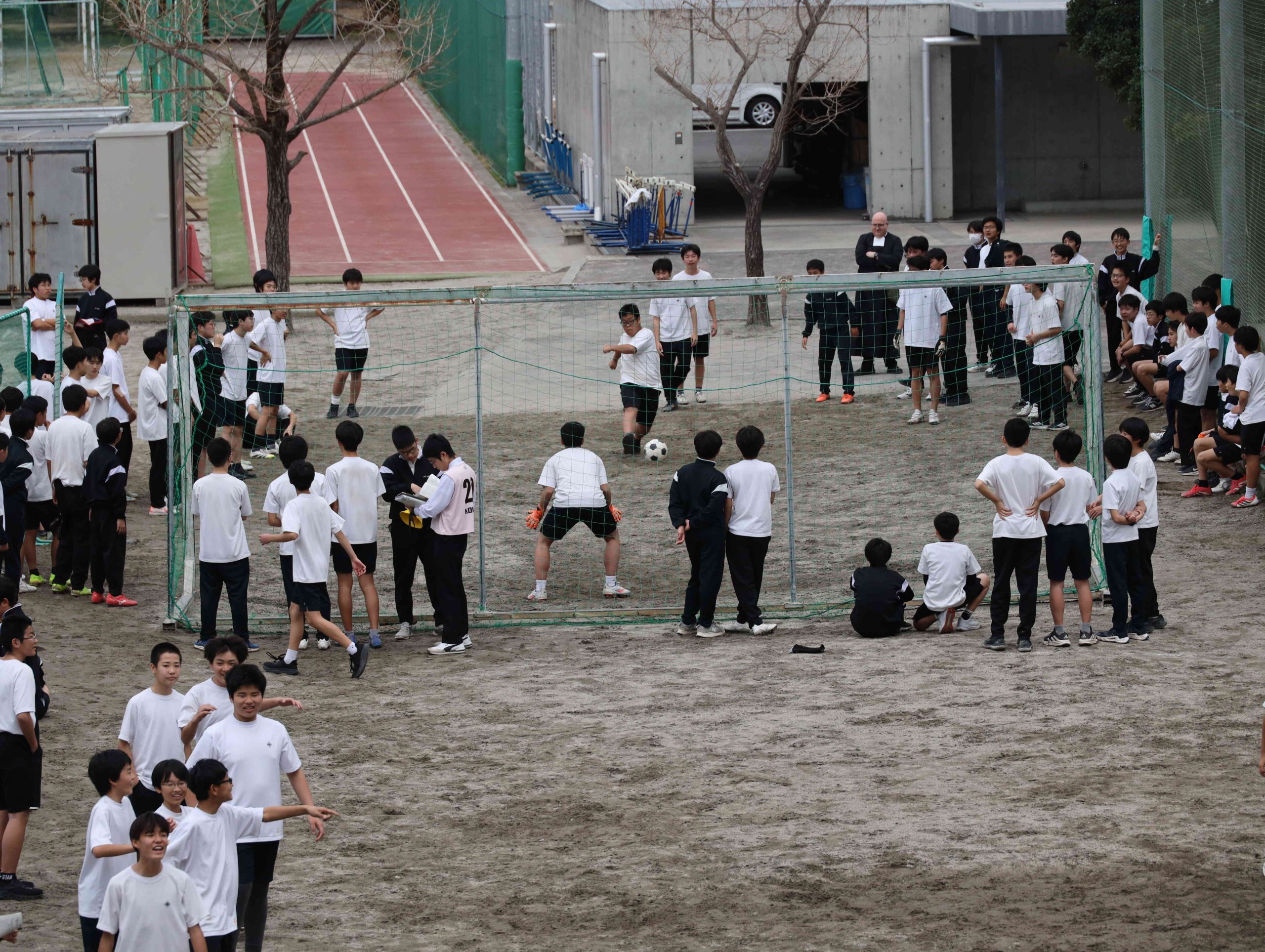 PK戦専用ゴールにて。校長はじめ多くのギャラリーが見守ります。
