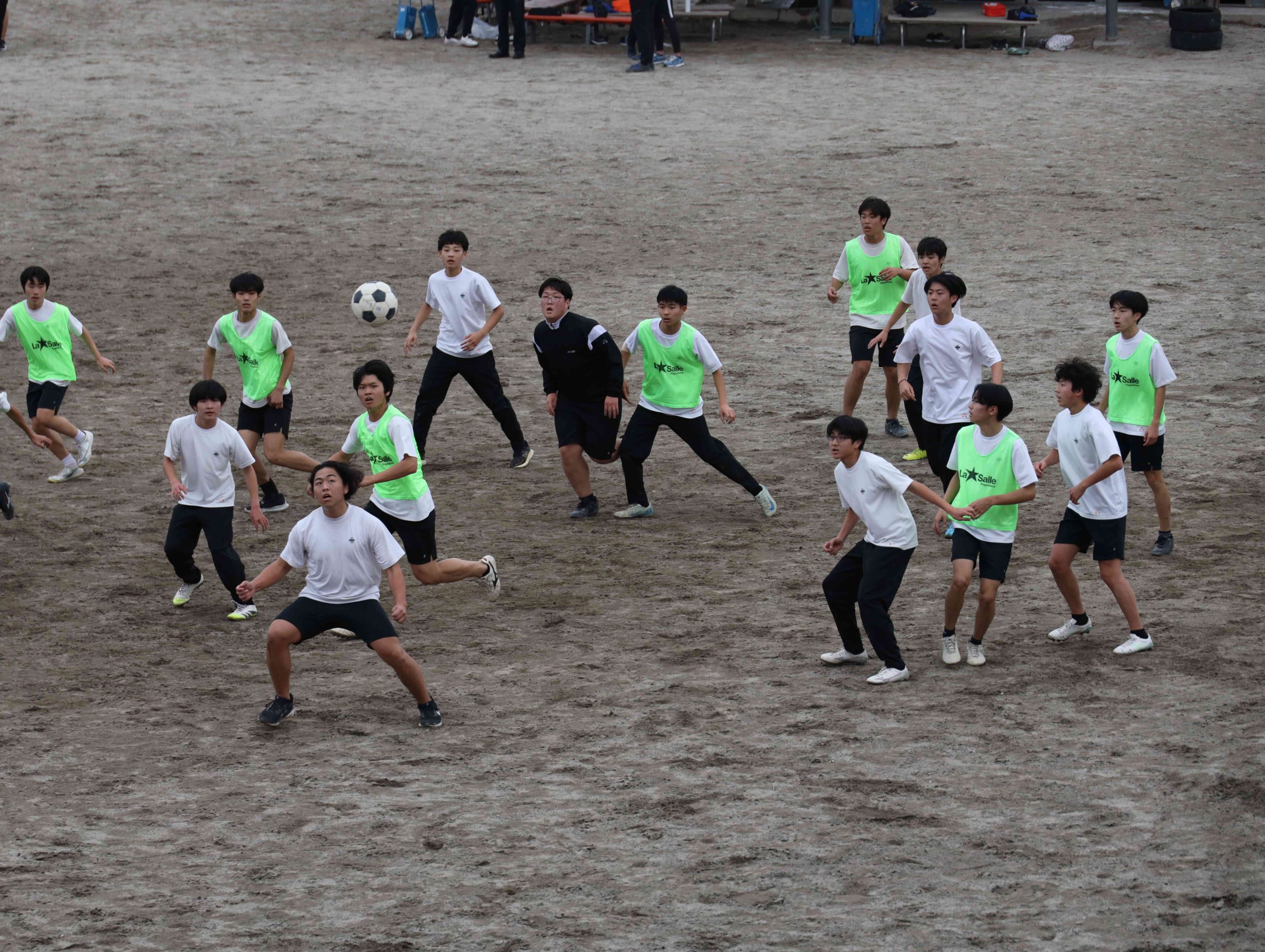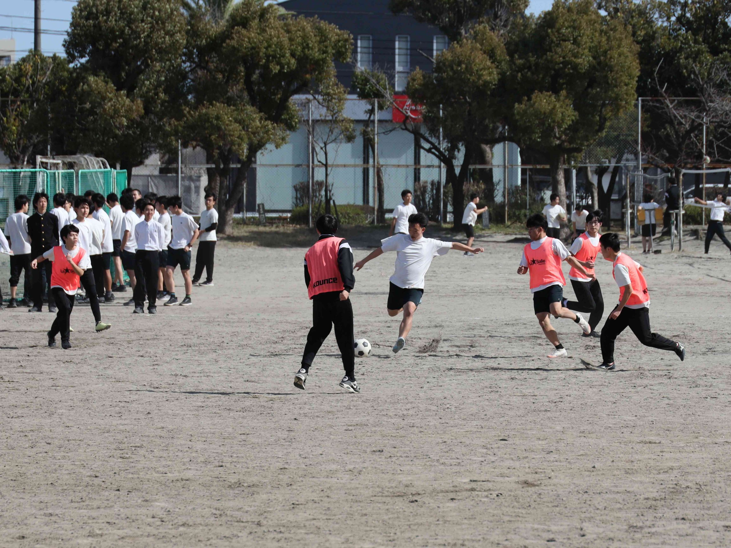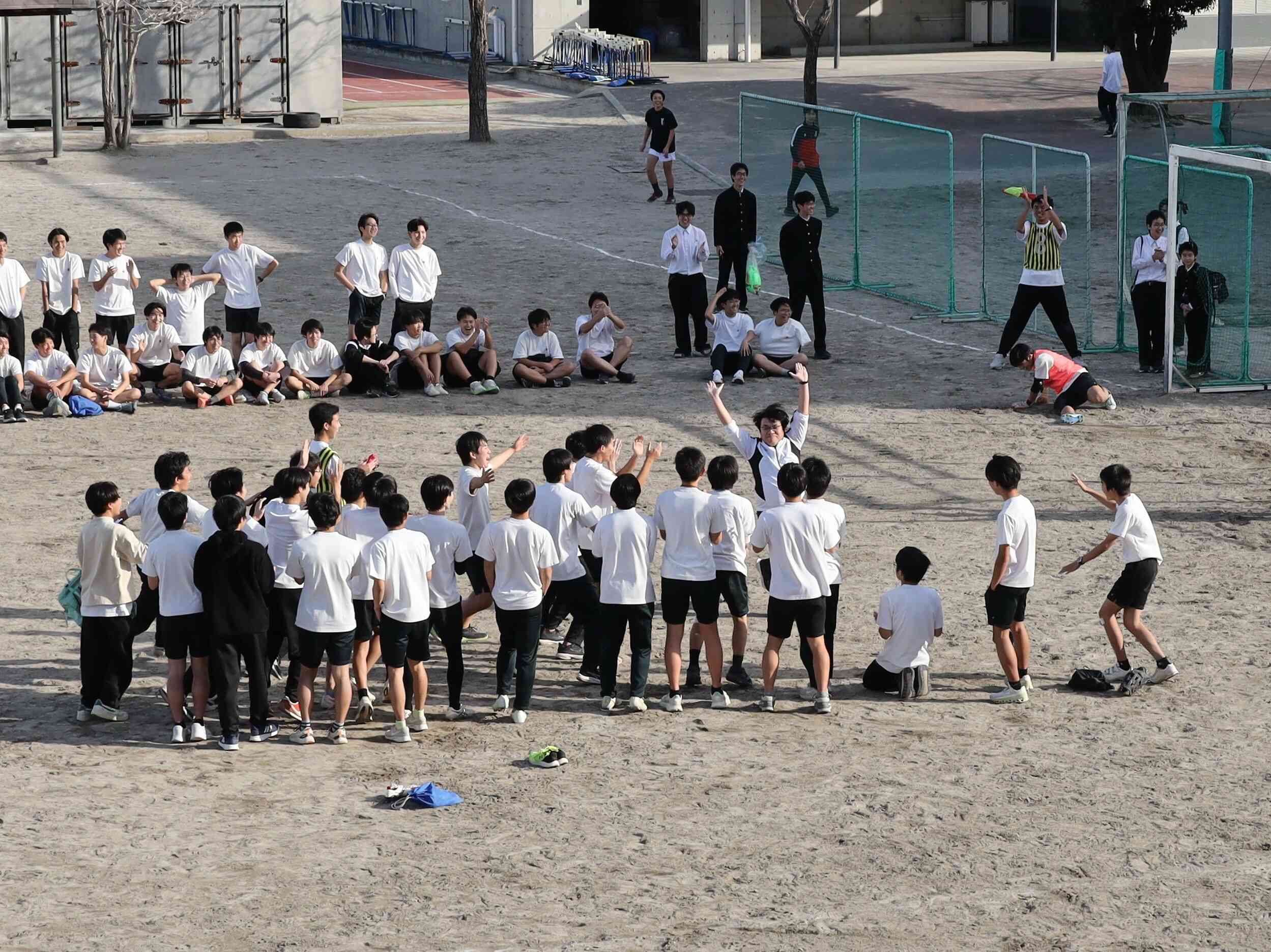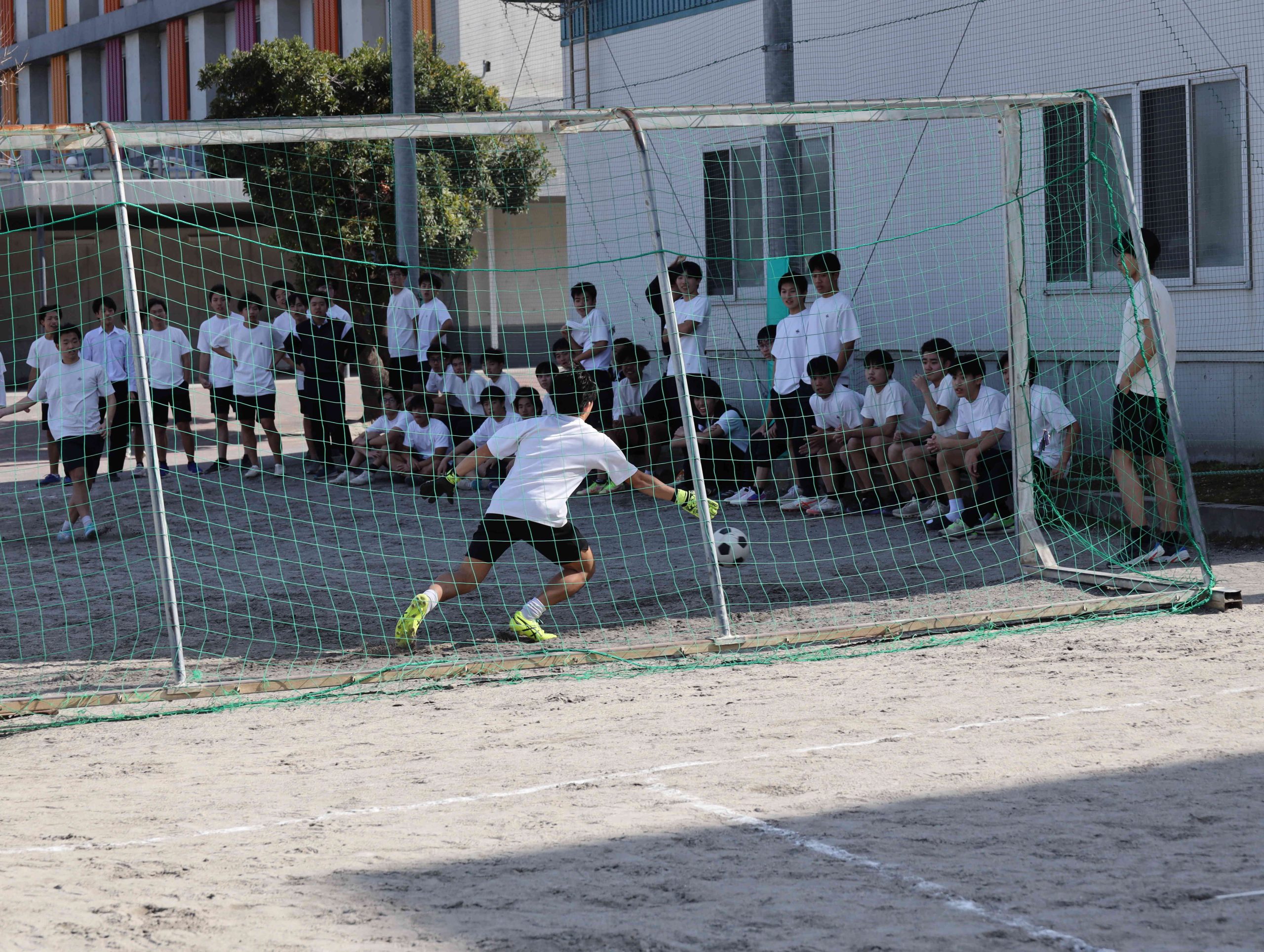 日程が短くなっても教員戦を必ずやるのが本校の流儀です。そのPK戦にたくさんのギャラリーが集まりました。Y先生が蹴ったボールの行方を、全員が目で追います。