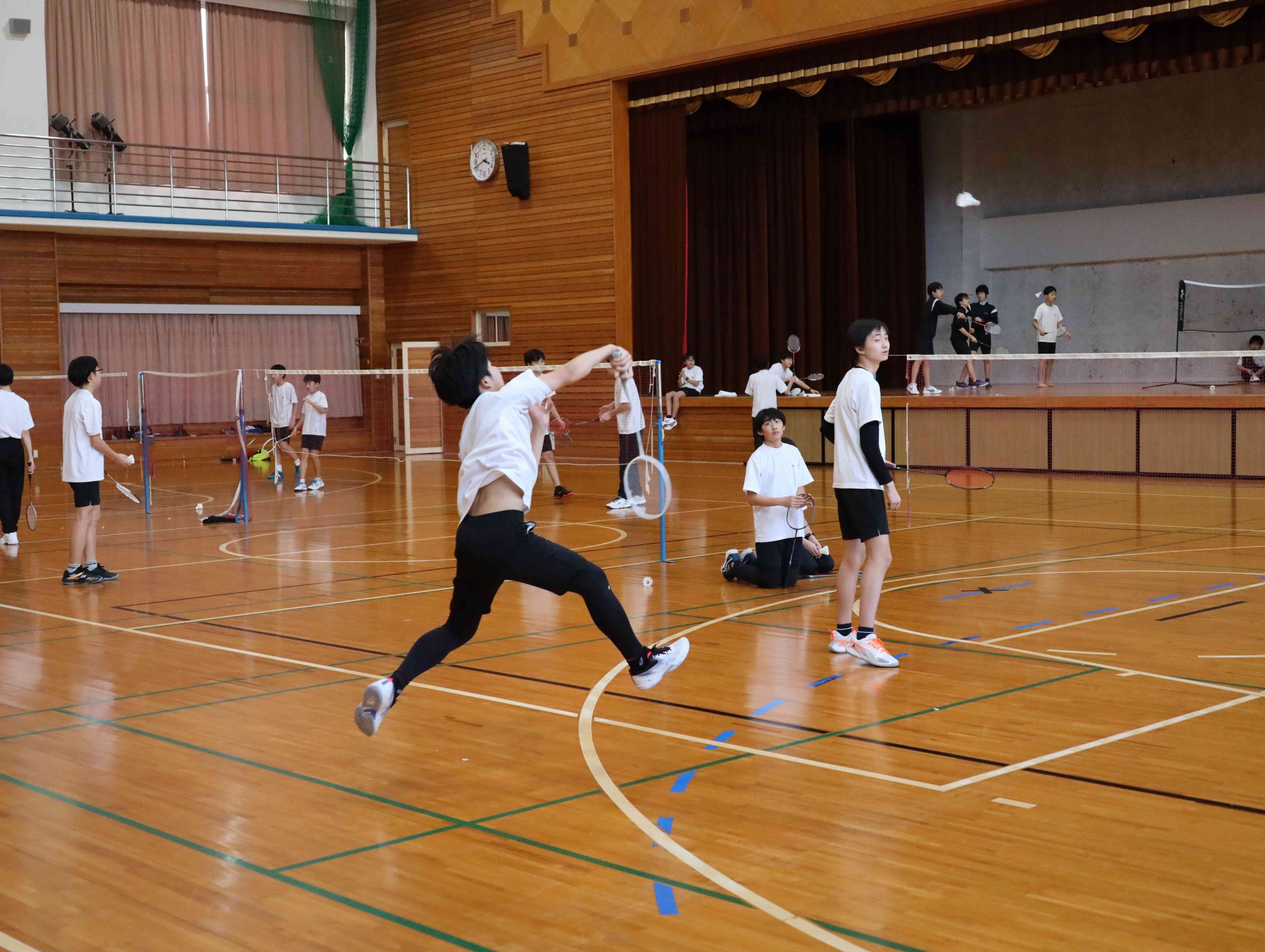 バドミントンの会場はヨセフホールです。見事なスマッシュが繰り出されます。