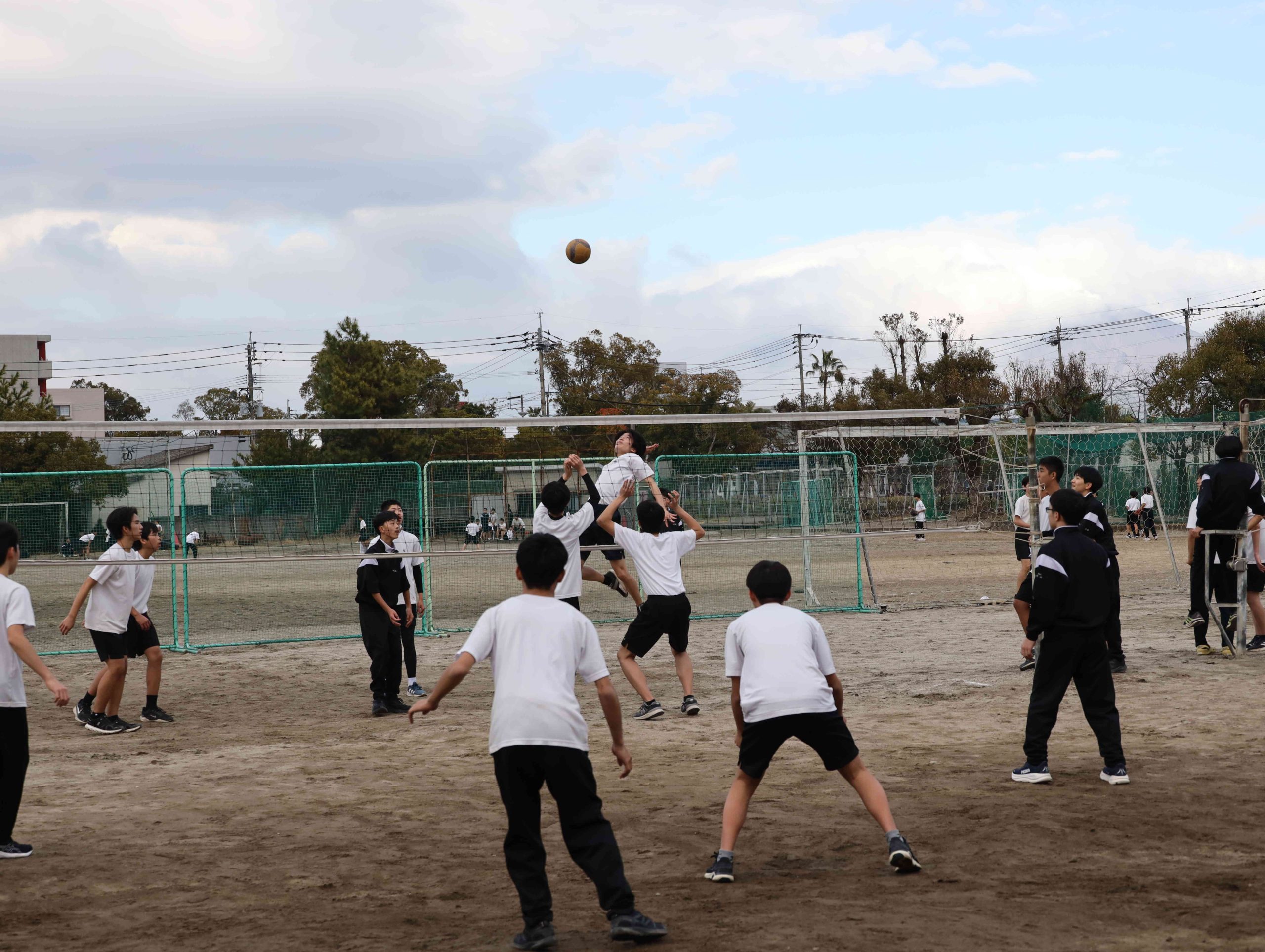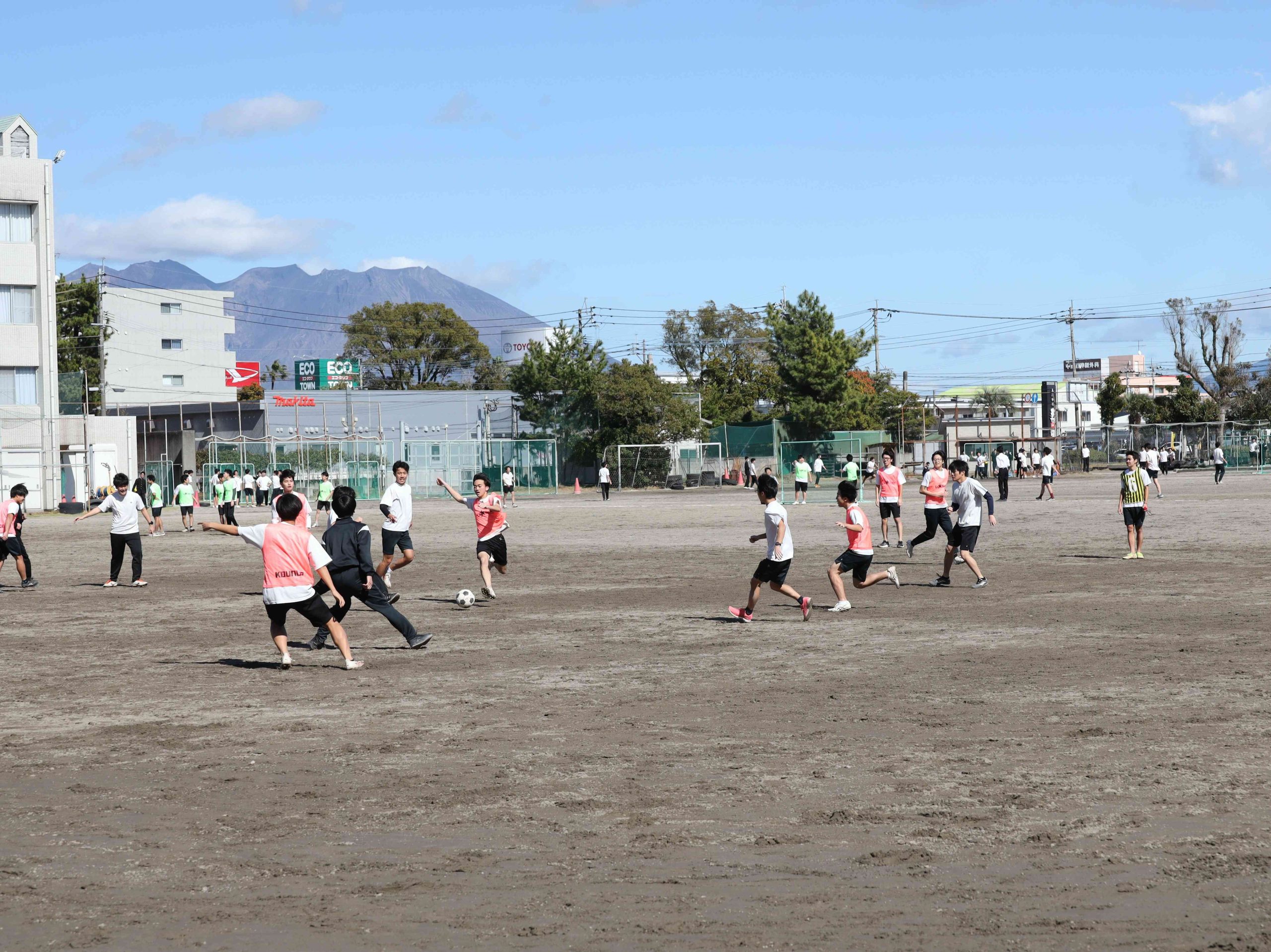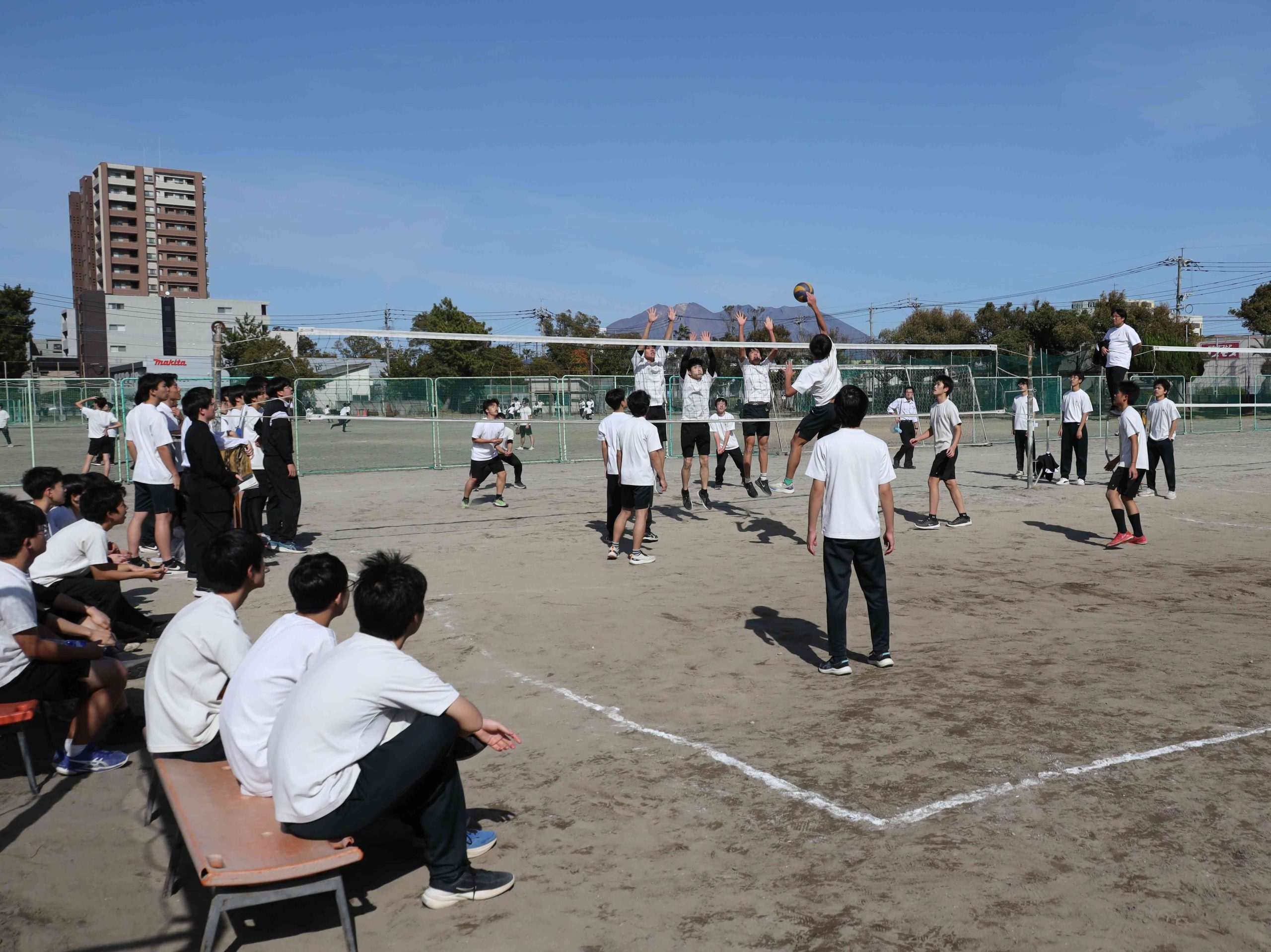 秋空の下、体育の授業です。奧には桜島が見えていますが、この日は噴火はありませんでした。