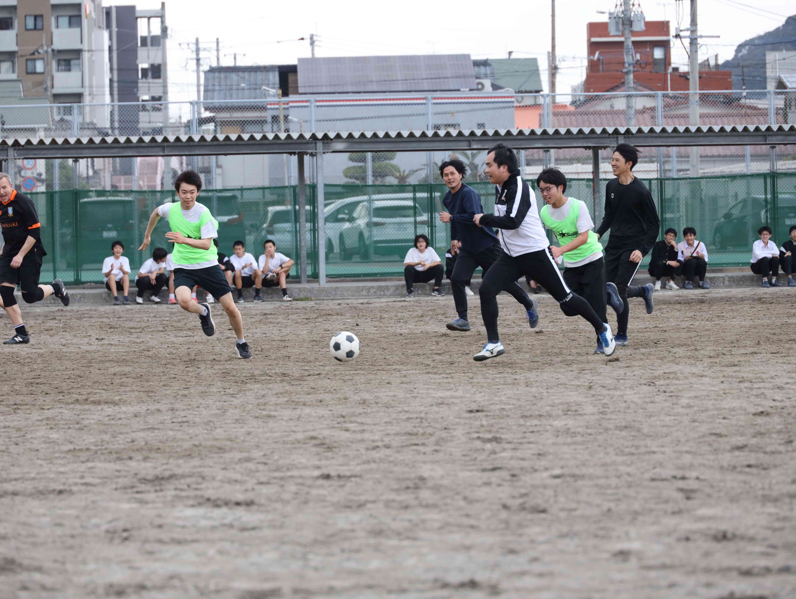 クラスマッチ名物の教員戦です。先生が元気に走り回って生徒の声援を受けました。