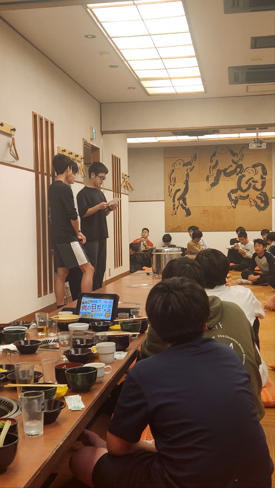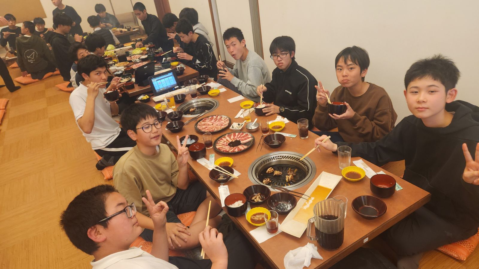 写真は中学2階寮の焼肉送別会の様子です。部屋ごとに座って、1年間一緒に過ごしたメンバーと楽しい時間を過ごしました。