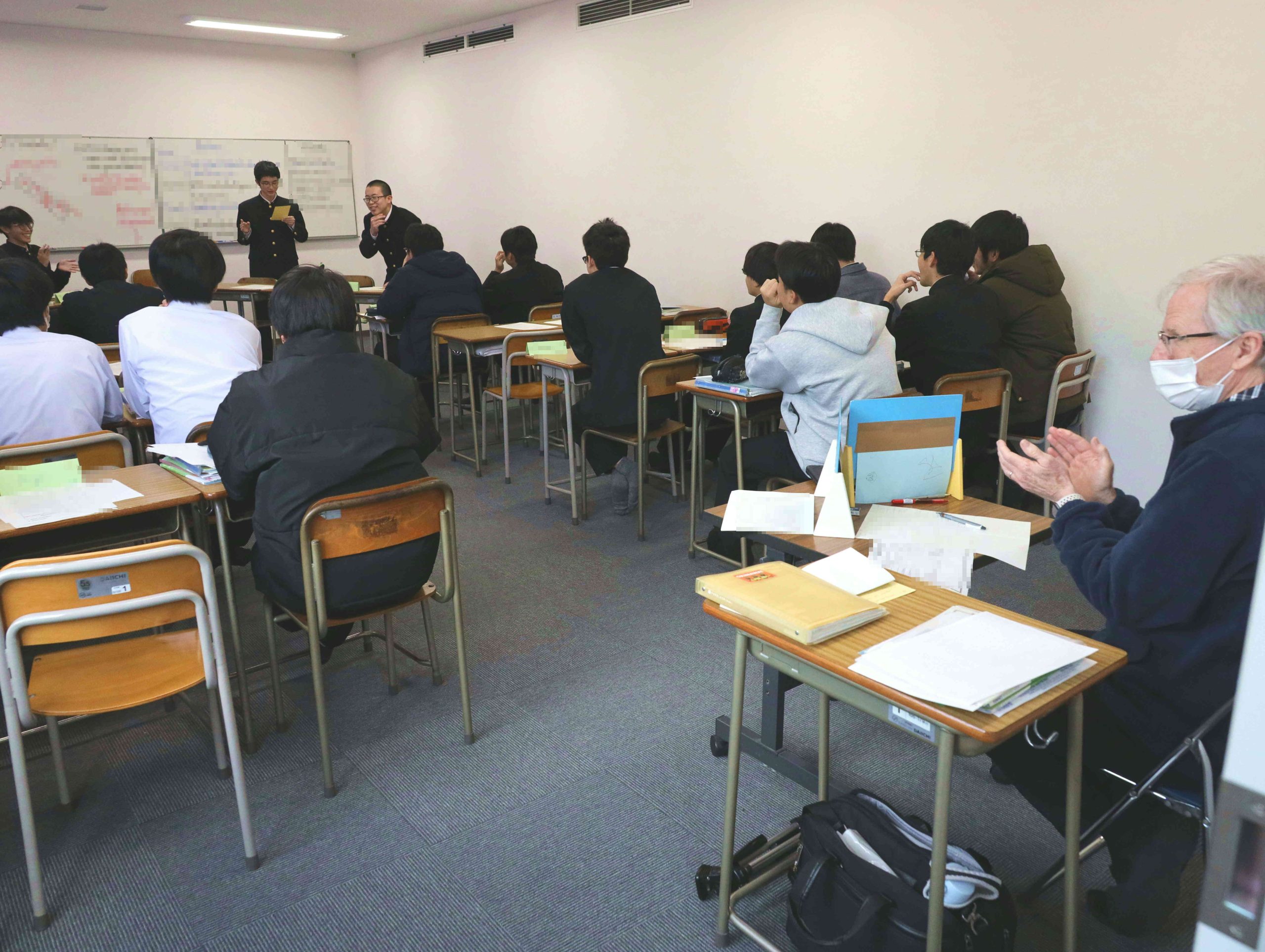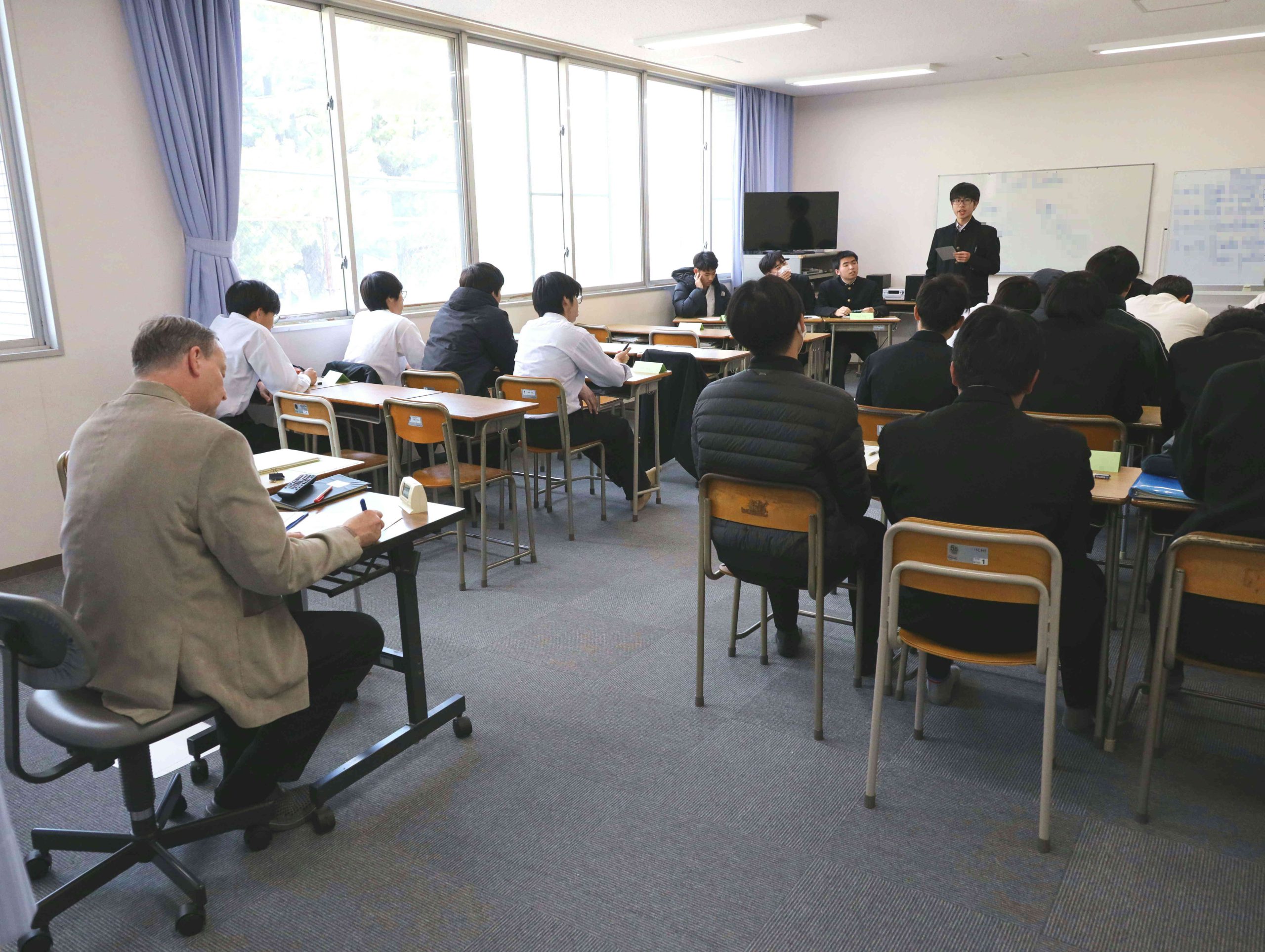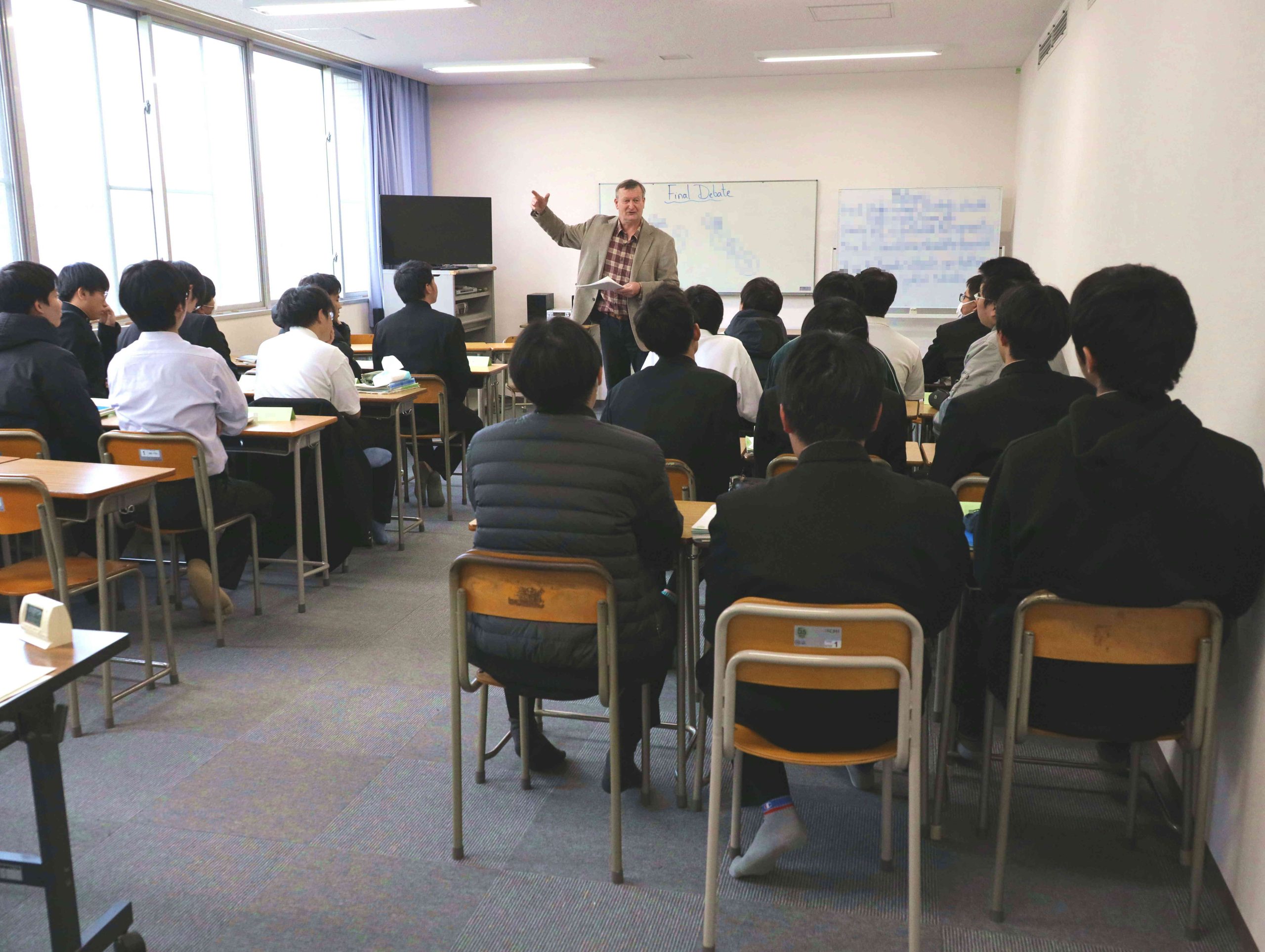 こちらは3階にあるドナキー先生の教室です。高校2年文系の生徒たちが英語ディベートをしています。4つのテーマについて8名が代わる代わる発表し、先生は最後列で聴き、所感をメモします。2階でも同様にディベートが進みます。