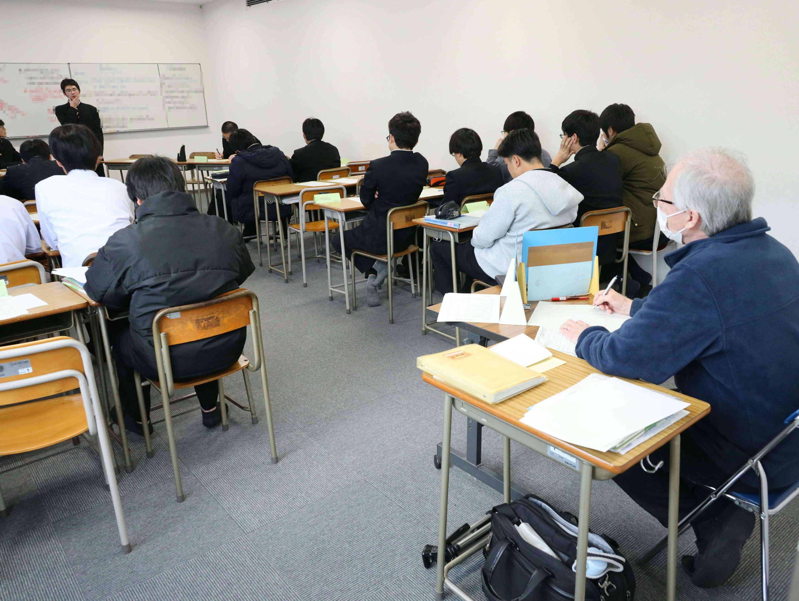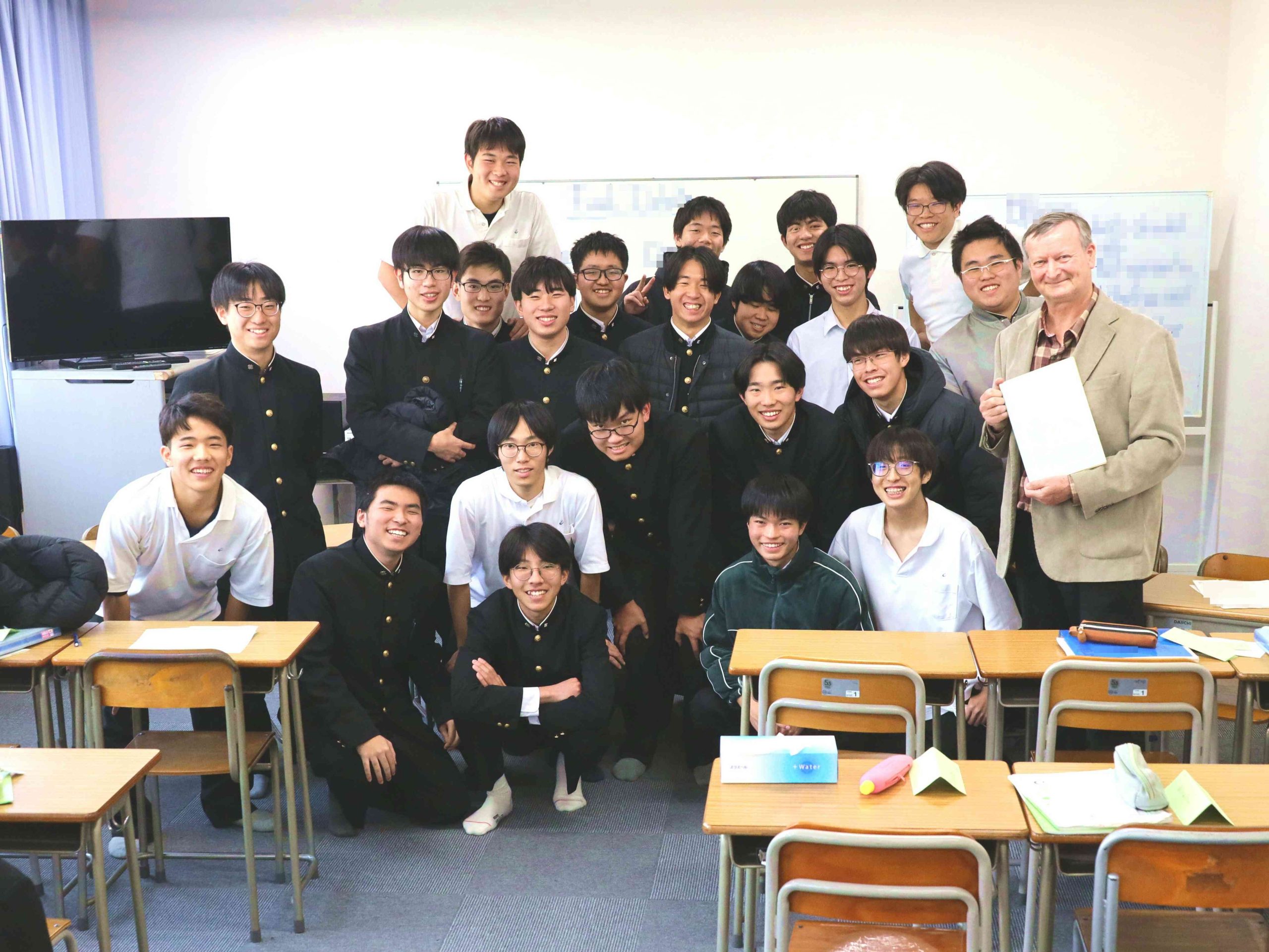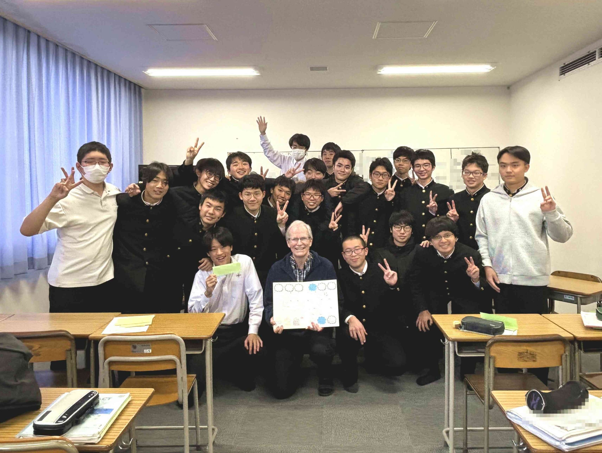 折しもこの日は高3の希望者対象特別補講の最終日でした。折角なので最後の教室掃除をしていた高3生や担任も一緒に記念撮影を行いました。