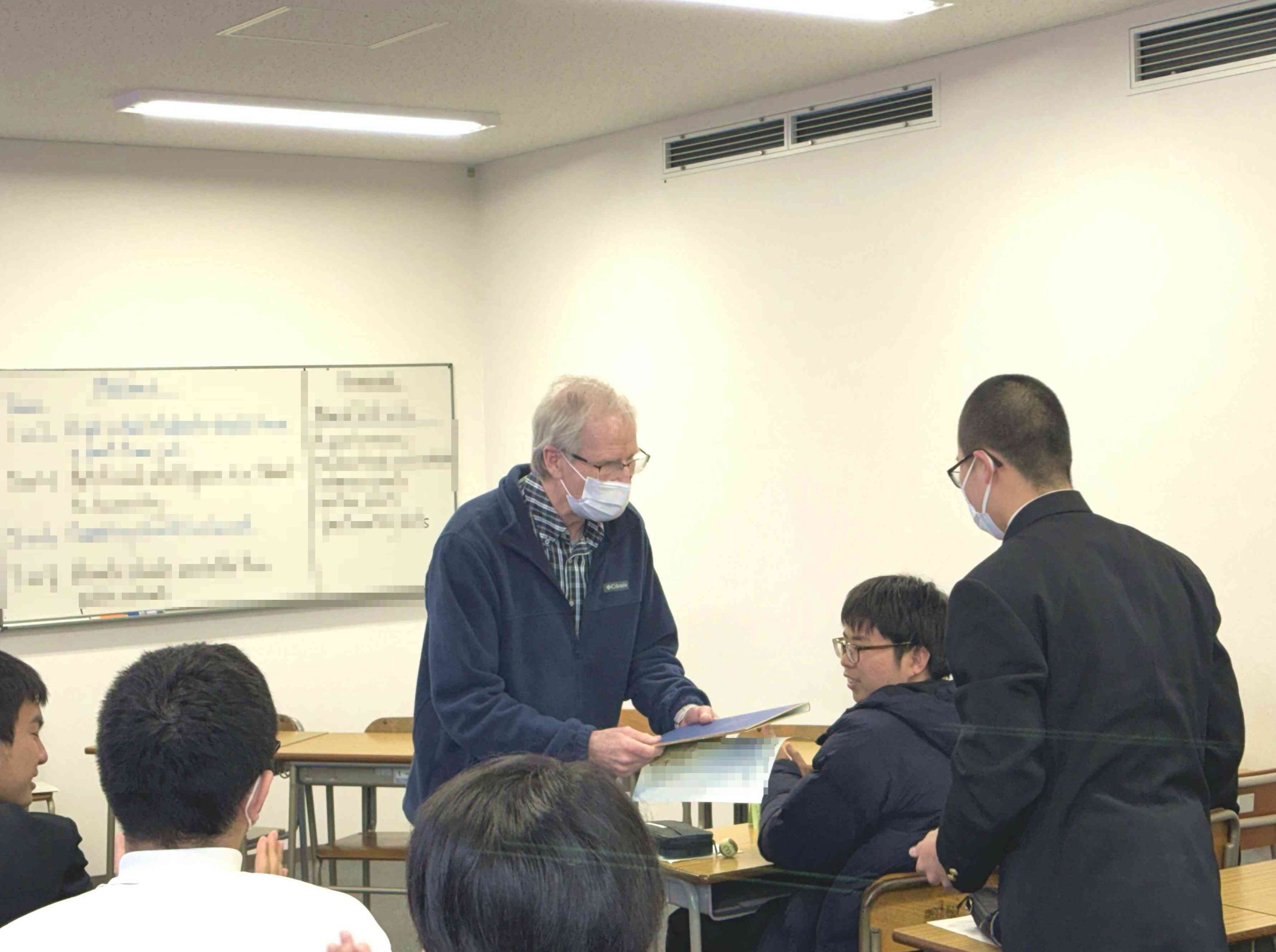 こちらでも生徒が寄せ書きを準備していました。代表の生徒が流暢な英語で感謝の言葉を述べ、寄せ書きを手渡しました。