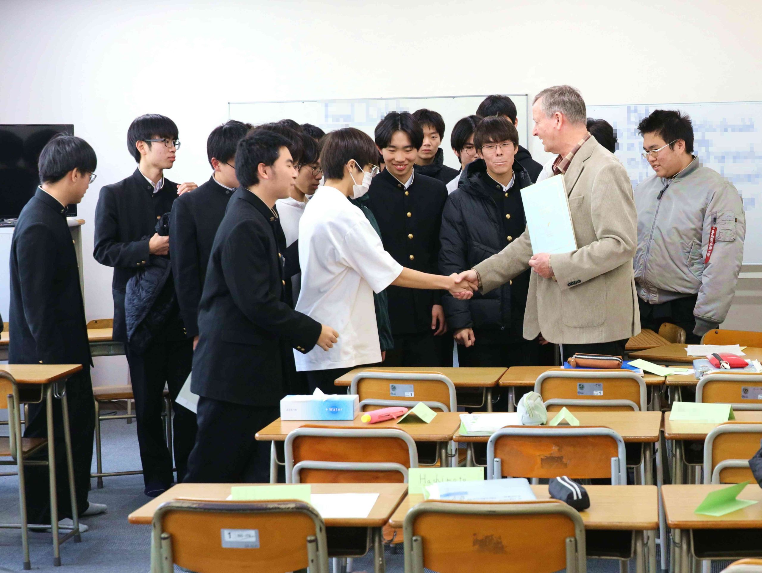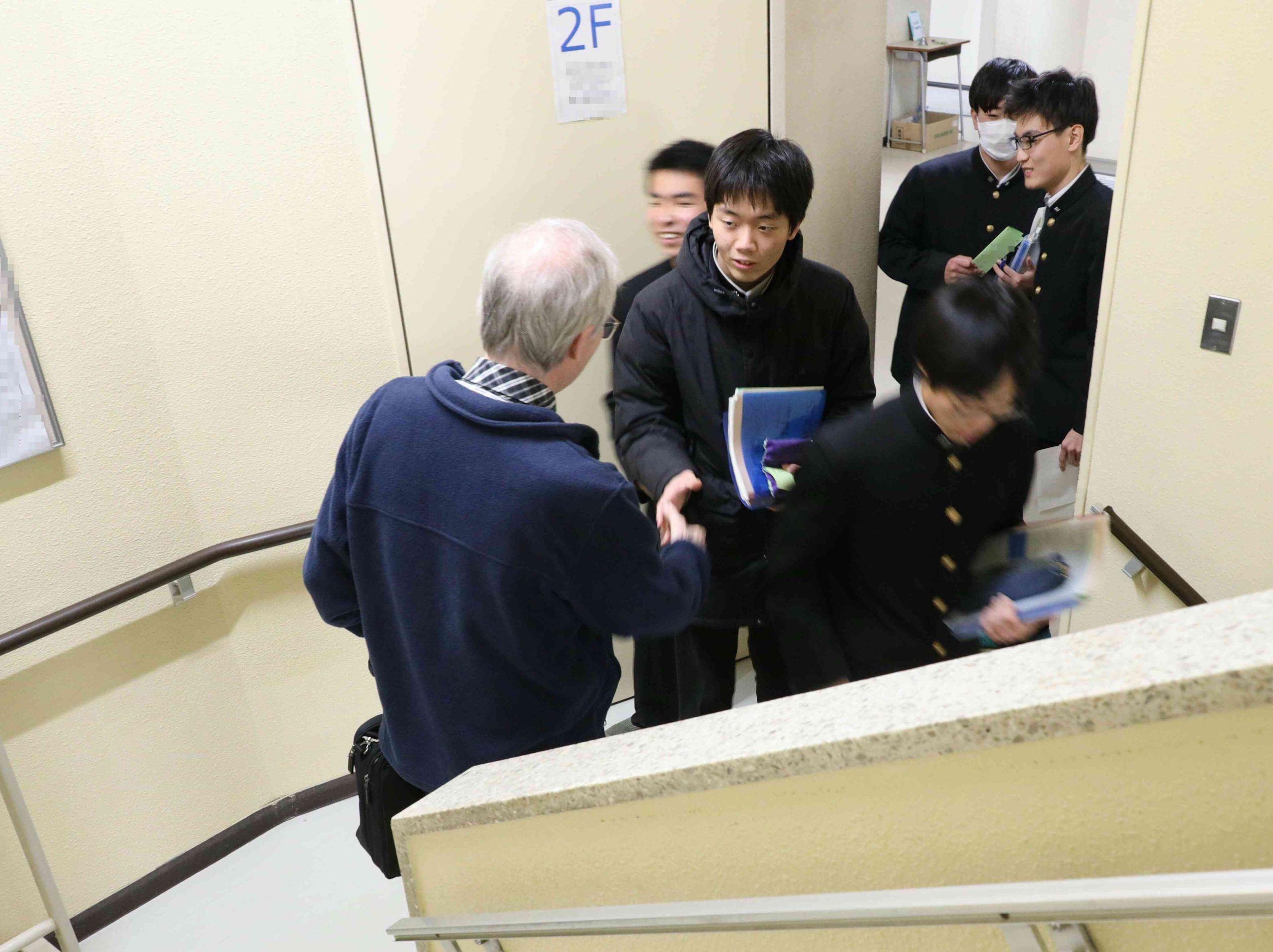 2階の生徒が教室に戻るタイミングで、授業を終えたドナキー先生がちょうど3階から降りてこられたので、2階の生徒たちはドナキー先生とも固い握手を交わし、笑顔で階段を降りていきました。