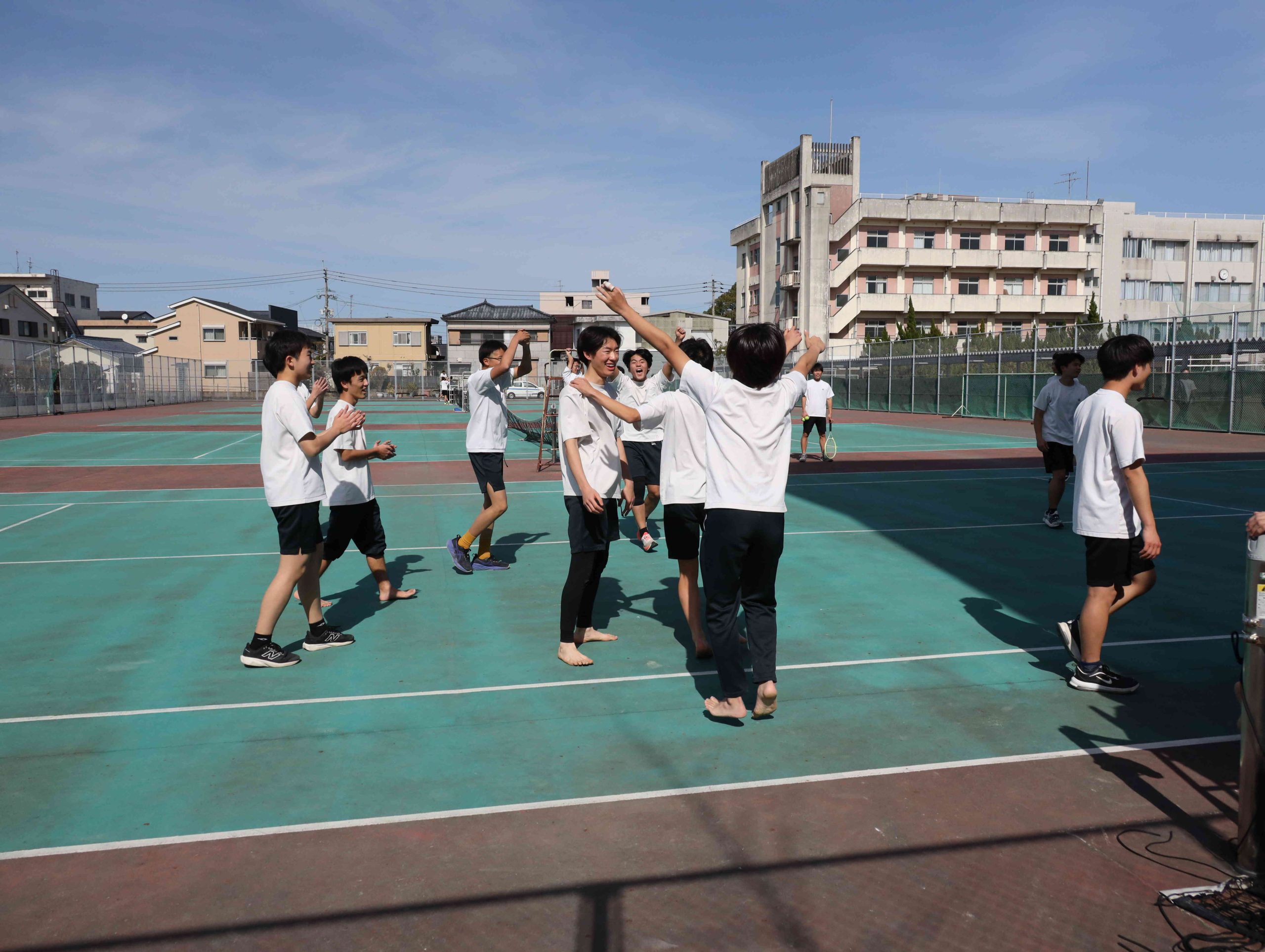 テニスコートを利用してドッジボールをしました。このチームが優勝し、喜びを爆発させています。