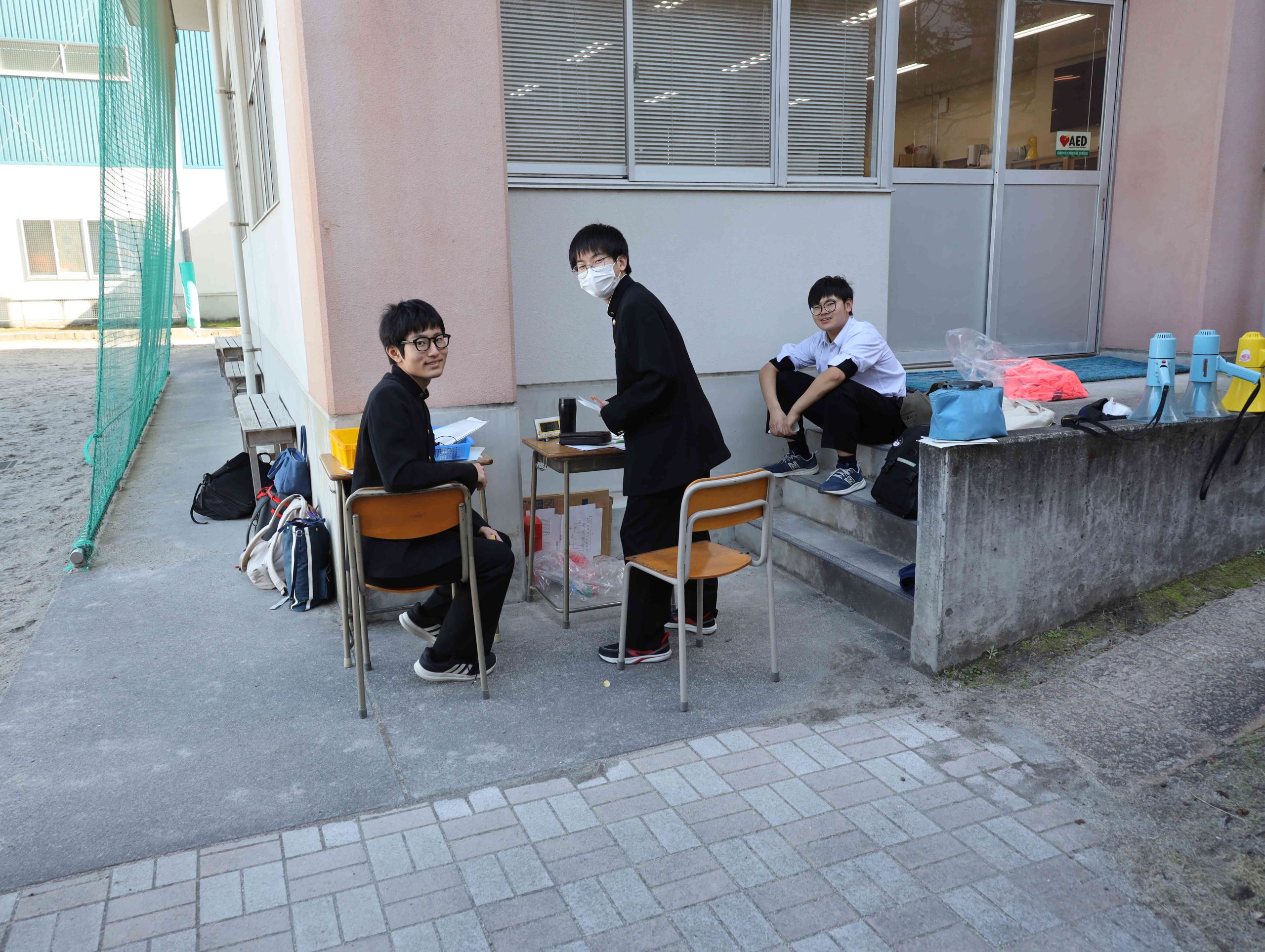 3限と4限の間の休み時間です。高校校舎3階のベランダは風がなく、日向ぼっこを楽しむ生徒たちが出ています。